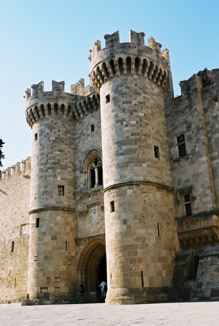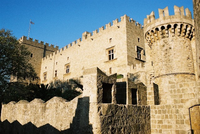 Właśnie oni przed wiekami panowali na wyspie, w razie wojen bronili jej, a został po nich najokazalszy zabytek miasta. Zamek, zwany często Pałacem Wielkich Mistrzów, miał mury grubości 12 metrów i przetrwał aż do 1856 roku, gdy zniszczył go wybuch magazynowanego w nim prochu. Odbudowali go władający wyspą Włosi z przeznaczeniem na przyszłą siedzibę króla Victora Emanuela II i Mussoliniego. Droga do zamku prowadzi ulicą Rycerską. Prawie wszystkie stojące przy niej budynki były przed wiekami zajazdami rycerskimi, stąd nad portalami widnieją herby poszczególnych narodów (m.in. Francuzów, Włochów). Panoramę miasta najlepiej oglądać z wieży zegarowej stojącej na skraju starówki. Na jednym z jej tarasów znajduje się barek, gdzie w cenie biletu wstępu na wieżę dostajemy zimne napoje.