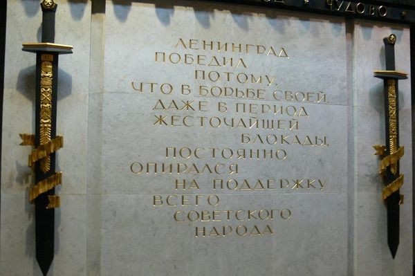 W podziemiach urządzono miejsce pamięci. Zgromadzono tu eksponaty związane z powszednim życiem oblężonego miasta: kartki, broń, przedmioty codziennego użytku. Znajduje się tu także Brązowa księga pamięci, będąca kroniką blokady miasta. Oglądam filmy dokumentalne, na ekranie przesuwają się obrazy głodujących ludzi, kolejki po chleb, ciężarówki jadące po tzw. drodze życia – zamarzniętym jeziorze Ładoga, bomby spadające na ulice miasta. Przychodzi tu wielu Rosjan. Wszyscy są milczący i dumni. Mieszkają w Mieście-bohaterze.