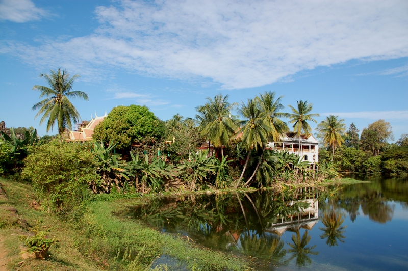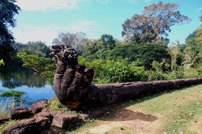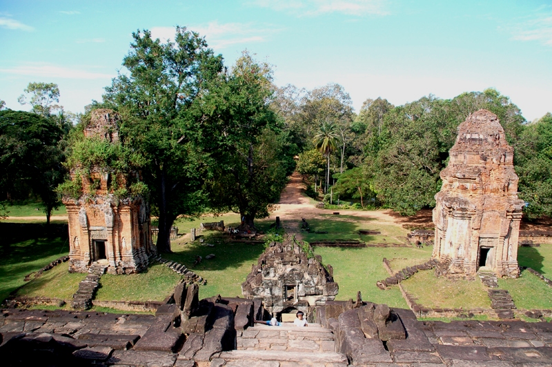 Otoczona jest przez dżunglę, a na jej terenie jest dużo soczystej roślinności. Robi ona ogromne wrażenie i to od samego wejścia. Droga na świątynne wzgórze prowadzi przez groblę, która w dalekiej przeszłości była zarazem głównym traktem miasta. Od strony przylegającej do niej fosy oddzielają ją kamienne bariery w kształcie węży naga z siedmioma głowami każdy. I one weszły później na stałe do klasycznej architektury khmerskiej. Pierwszy, zewnętrzny pas kamiennych murów ma kształt prostokąta. Przekracza się go przez budowlę nadbramną zbudowaną na planie krzyża. Po prawej stronie dostrzegam skryte w zieleni i wśród palm rosnących nad fosą grupę budynków. W jednym, nowoczesnym, ale w tradycyjnym stylu khmerskim mieści się buddyjski klasztor. Obok niego, w innych budynkach, mieszka personel obsługujący zabytek. Dalej droga prowadzi do stóp świątynnego wzgórza, między dwiema kaplicami oraz podłużnymi budynkami po bokach. Budowli i ich ruin na tym dosyć rozległym terenie jest więcej, m.in. z ażurowymi ścianami, uważana przez wielu badaczy za dawne krematorium, w którym zgodnie z hinduistycznym obyczajem spalano zwłoki zmarłych.