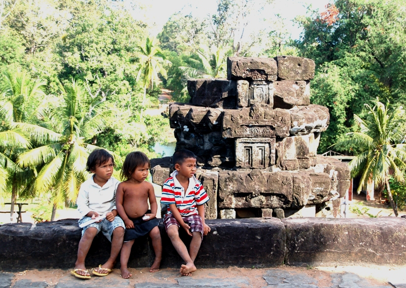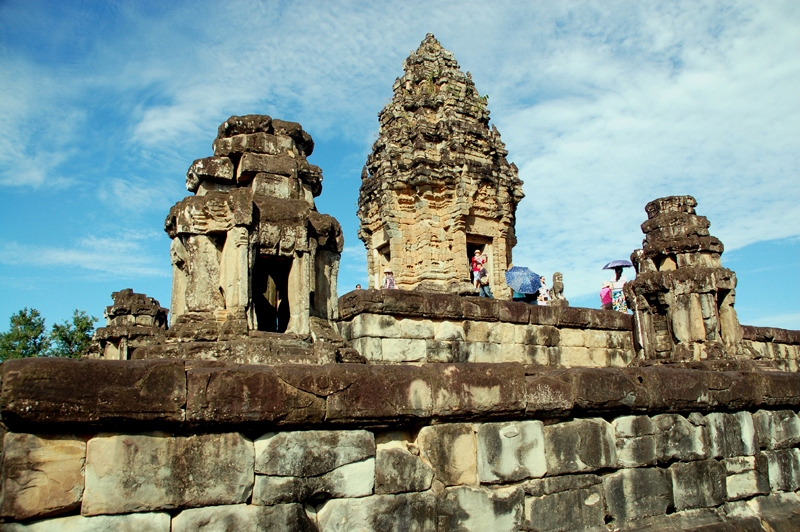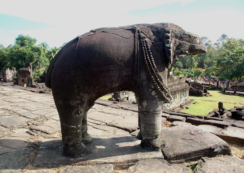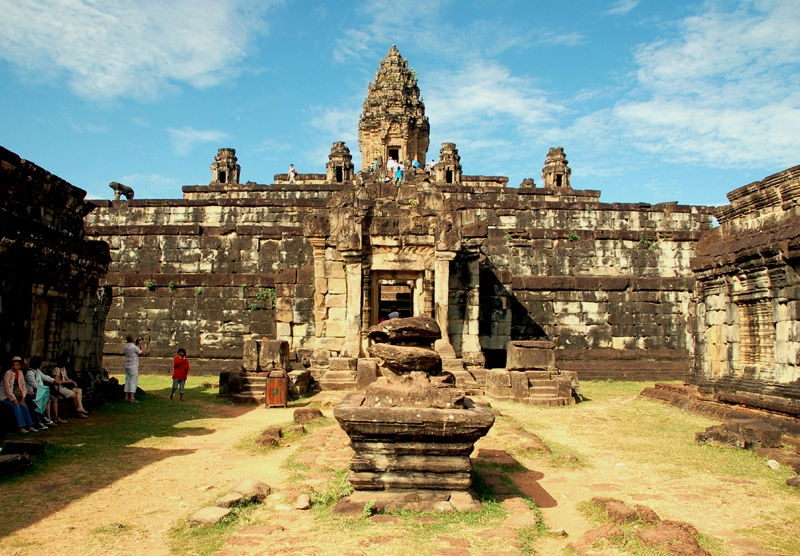 Pokonuję kolejne schody, bramy, platformy, aby znaleźć się pod murami masywnej świątyni. Pięciopoziomowej kamiennej piramidy otoczonej kilkoma wieżami zbudowanymi z cegieł i piaskowca. Wchodzę aż na szczyt, do wewnątrz górującej nad świątynią jej głównej wieży zakończonej stożkowatą kopułą. Powoli oglądam niezliczone, niektóre wspaniale zachowane rzeźby, płaskorzeźby i dekoracje wykute w kamieniu. Mityczne postacie walczących demonów, dekoracje roślinne, posągi kobiet ustawione we wnękach murów itp. Z górnego tarasu na którym wznosi się ta wieża roztacza się panorama na otaczającą zespół świątynny dżunglę oraz najbliższą okolicę. Widzę wiele zrujnowanych budowli, ale również i zachowane w niezłym stanie. Fotografuję trójkę miejscowych dzieciaków siedzących na murku otaczającym ten taras i kamiennego słonia naturalnej wielkości, chociaż z odtrąconą trąbą. Duże posągi lwów strzegących schodów oraz liczne ciekawe detale architektury. Przypadkowo trafiam w jednym z pomieszczeń na współczesne miejsce kultu.