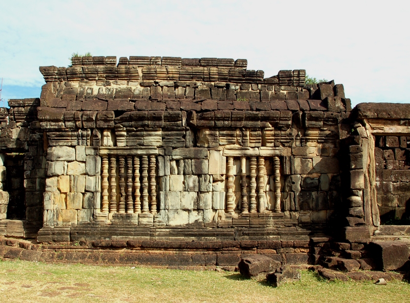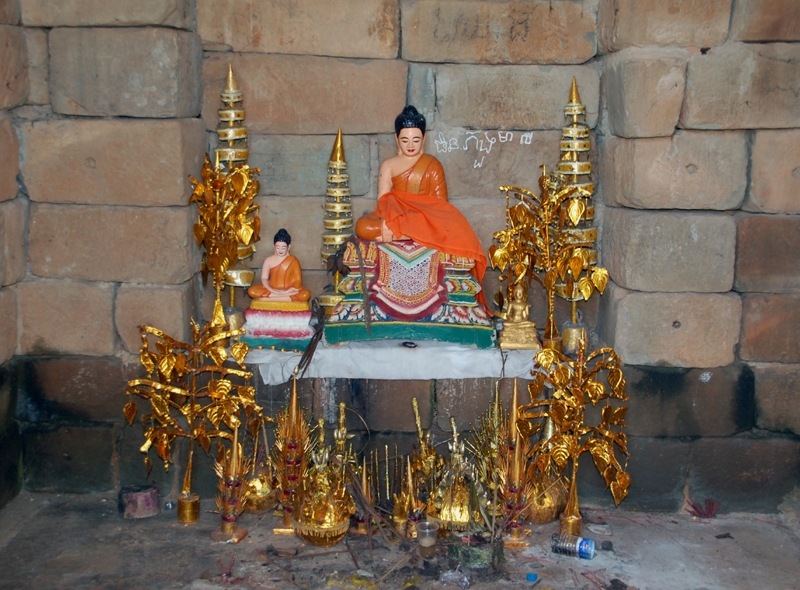 Jest to ustawiony pod kamienną ścianą ołtarz z dwoma dosyć kiczowatymi posągami siedzącego Buddy oraz metalowymi, w kolorze złotym, kwiatami i roślinami przed nimi. Dla mnie jest to jakiś dysonans, zgrzyt w tym zabytkowym, pięknym i ciekawym obiekcie. O znaczeniu, jak już wspomniałem, także symbolicznym. Kompleks świątynny w dawnej stolicy Hariharalaya zainspirowany został bowiem przez hinduistyczne widzenie świata. Bakong symbolizuje górę Meru. Woda w otaczającej go fosie ? kosmiczny ocean z którego wyrasta ta góra i otaczający ją ląd zamieszkany przez ludzi. Zaś otaczające je góry ? mury miejskie.