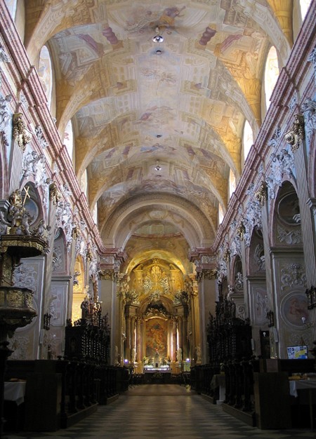 Romańsko-gotycki kościół nosił wezwanie, zgodnie ze zwyczajem cystersów, Wniebowstąpienia NMP. Obecny drugi jego człon ?i Cyryla i Metodego? dodał mu dopiero w 1932 roku papież Pius XI. Pierwotnie kościół miał 99 m długości oraz trzy nawy. Współczesny jest krótszy ? liczy tylko 86 m, gdyż podczas wczesnobarokowej przebudowy w XVII w na miejscu frontowej części romańskiej wzniesiono dwie wieże, zamieniając równocześnie nawy boczne na 14 kaplic, z których 10 z ołtarzami i kryptami pod podłogą. To była tylko jedna, chociaż szczególnie ważna dla współczesnego nam wyglądu świątyni, jej przebudowa. Kościół i klasztor przechodziły bowiem burzliwe dzieje. W roku 1421 zostały spalone i częściowo zniszczone przez morawskich husytów i przez 1,5 wieku nie było środków, aby je odbudować.