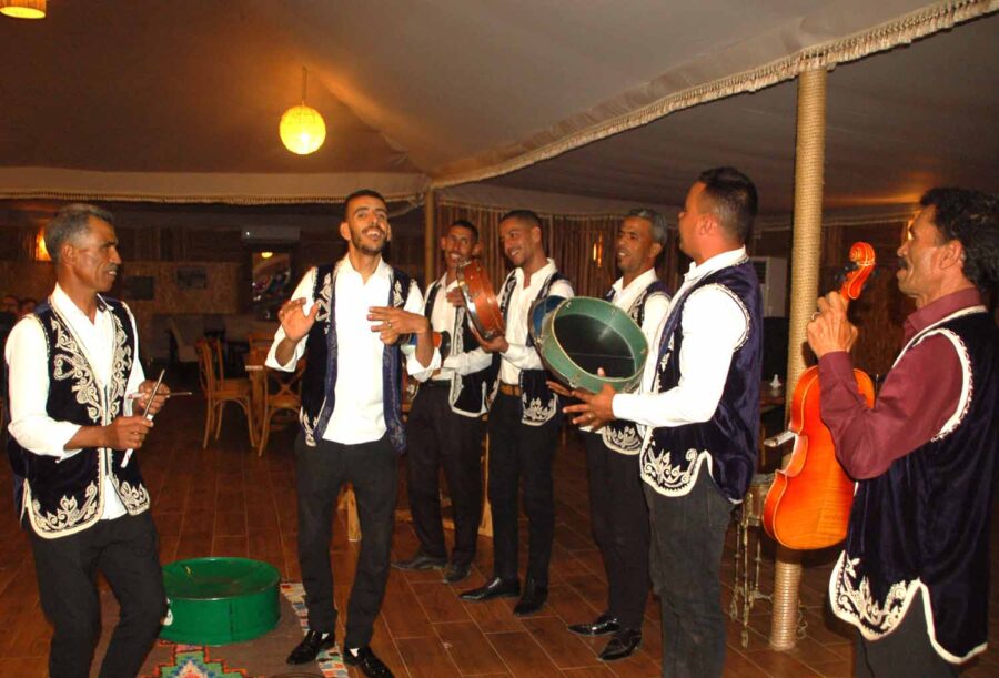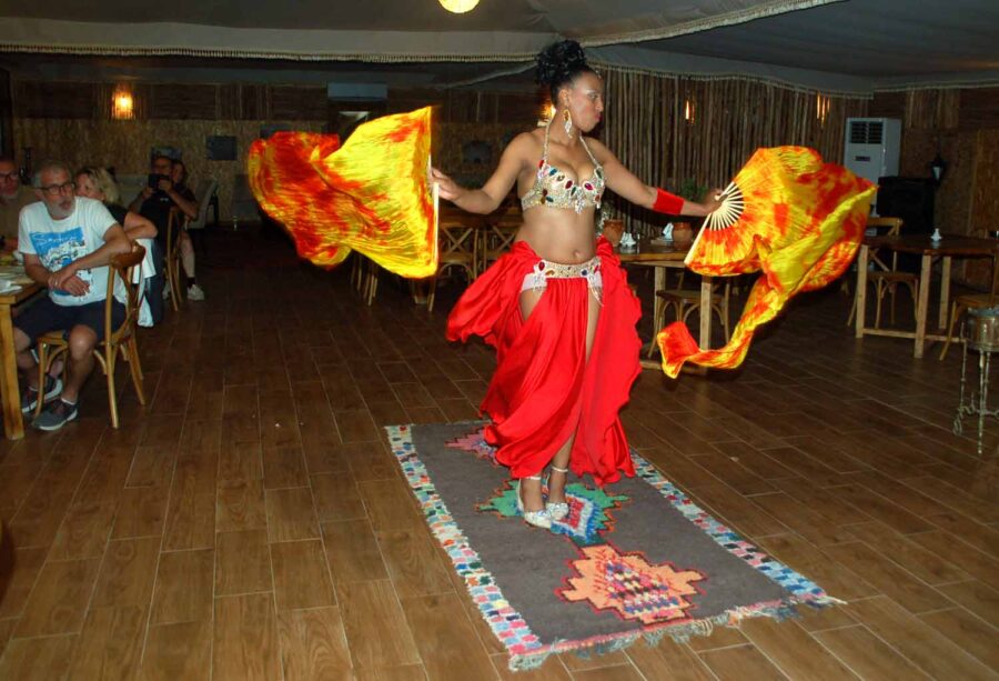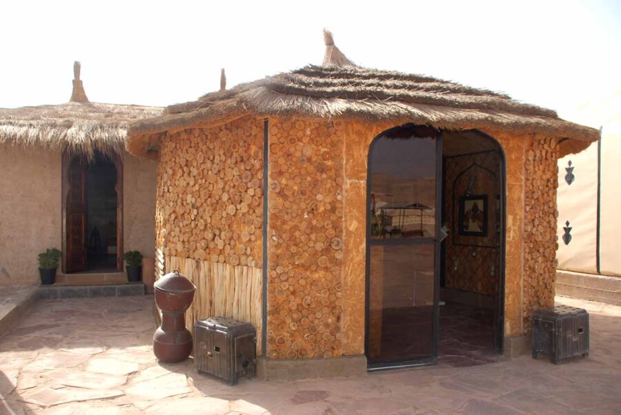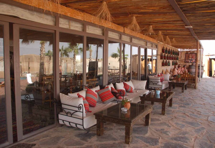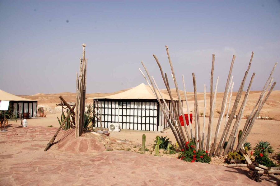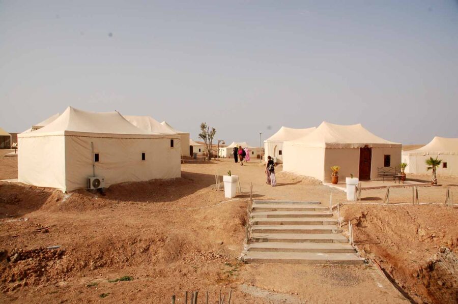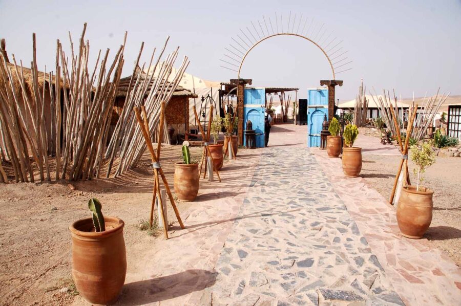 Zaraz za zakrętem pojawiają się dosyć liczne, chociaż zlokalizowane w prymitywnych zagrodach, z namiotami lub budami, wypożyczalnie quadów oraz wielbłądów, na których można zwiedzać okolice. Mijamy chyba kilkanaście, ale nie ma mowy o sfotografowaniu ich z okien mikrobusu, tak trzęsie. Za kolejnym zakrętem pojawia się nareszcie nasz cel podróży. Z daleka widać duże namioty na zboczu wzgórz, po chwili mijamy ustawioną na pustyni bramę.