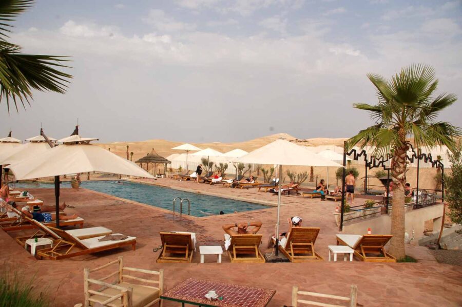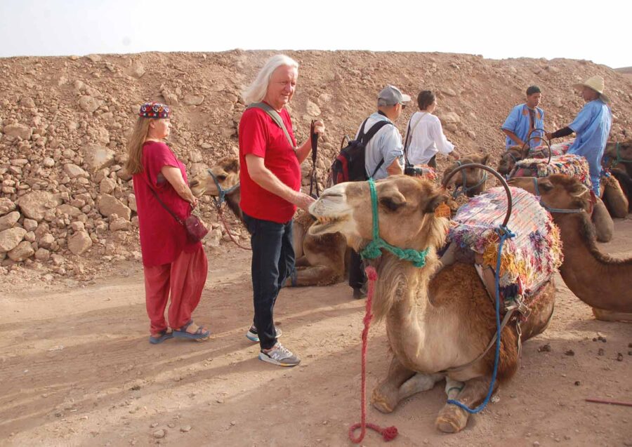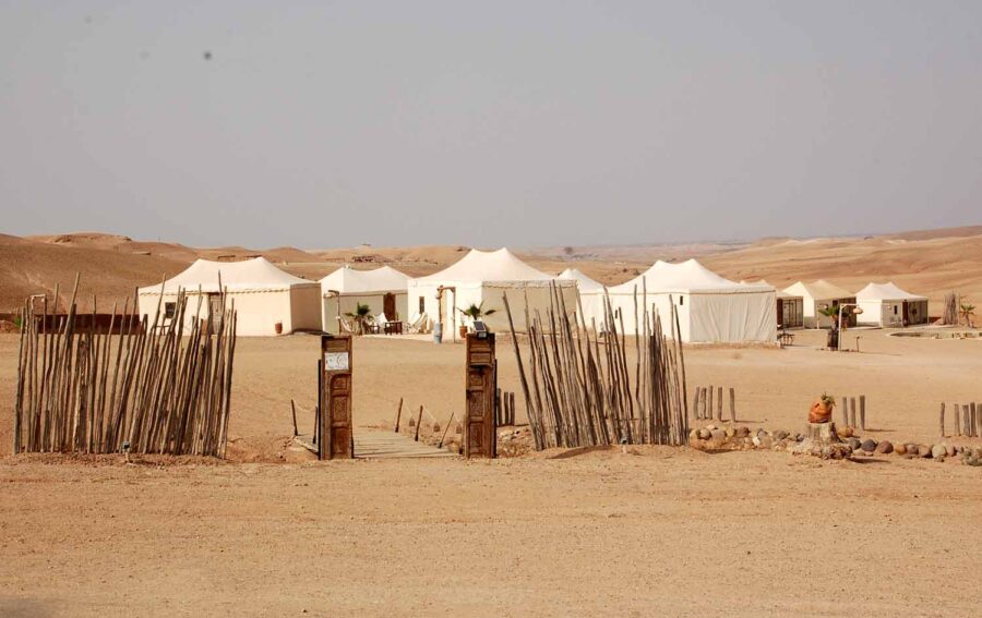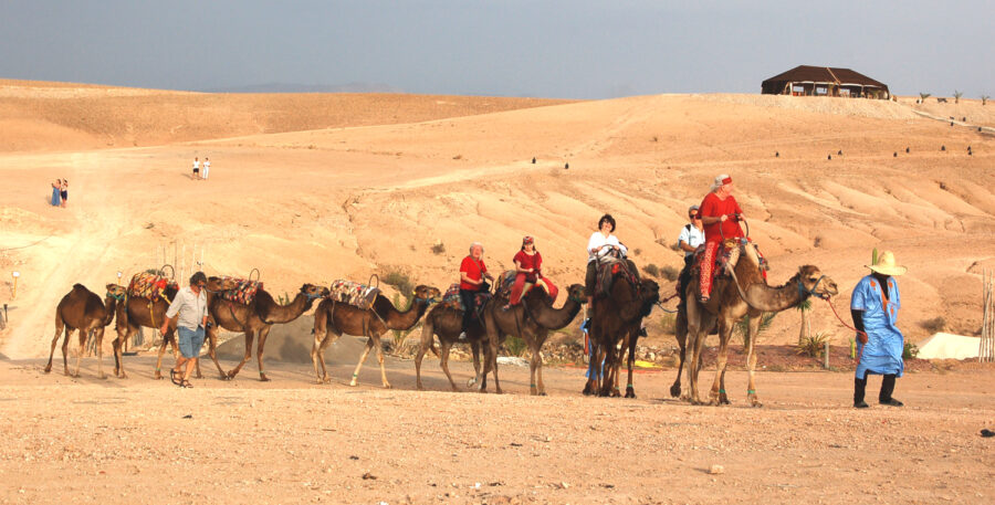 Niewielka pustynia rozciąga się w odległości niewiele ponad 30 km na południowy zachód od Marrakeszu. Jedziemy tam na jedno popołudnie i noc, do ośrodka wypoczynkowego White Camel, czyli Biały Wielbłąd. Najpierw dobrą szosą z Marrakeszu w stronę Agadiru, najpopularniejszego miasta wypoczynkowego w Maroku nad Atlantykiem, do którego lata, głównie liniami czarterowymi i tanimi, większość polskich turystów.