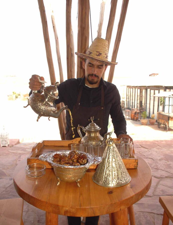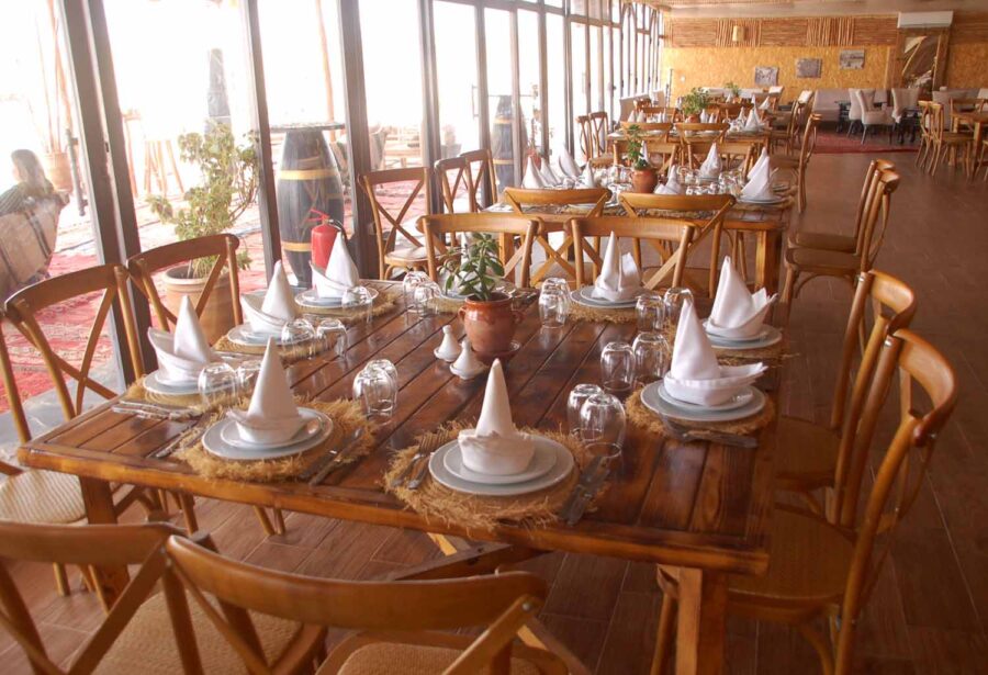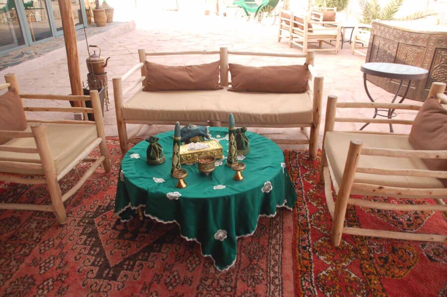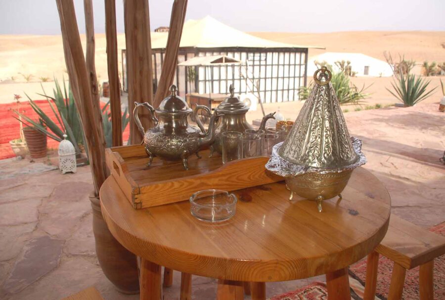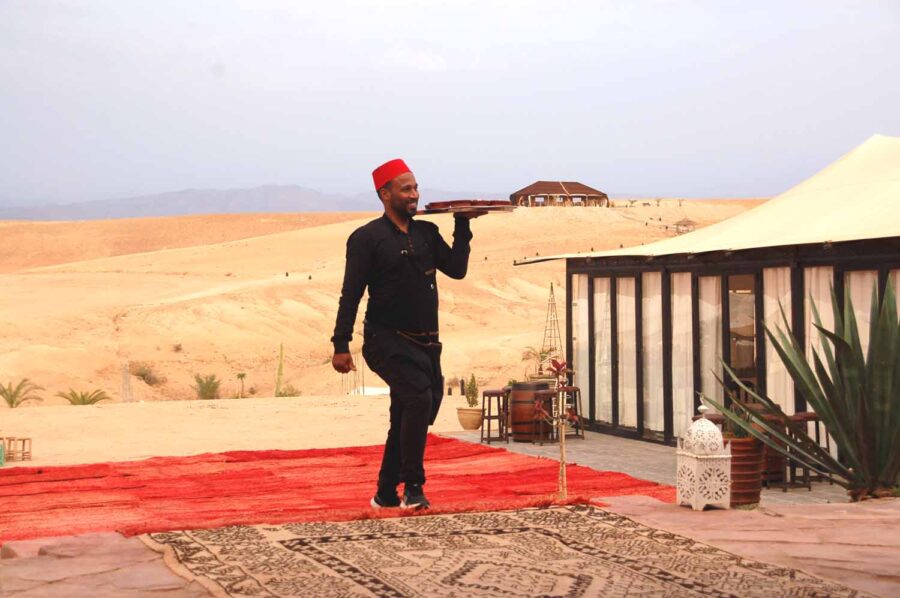 Informacja w internecie o Białym Wielbłądzie jest miejscami tak „poetycka” i zabawna, że przytoczę ją, w tłumaczeniu, w całości: „Położone w sercu spokojnej pustyni Agafay, nasze ekskluzywne domki oferują niezrównane sanktuarium odosobnienia. Te raje są ponadczasowymi świadkami piękna ciszy, zapraszając każdego gościa do zatrzymania się i zanurzenia w chwili, której nieubłagany bieg czasu wydaje się poddawać. Z każdym oddechem w tej spokojnej oazie duszę wypełnia poczucie odnowionego celu i jasności.