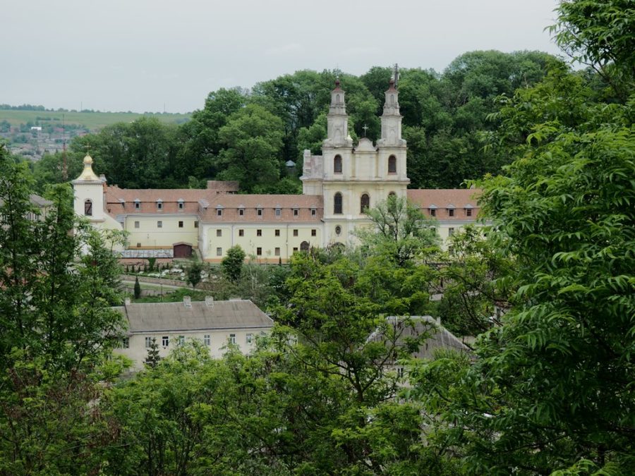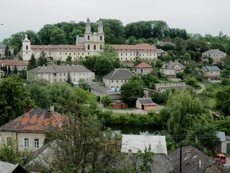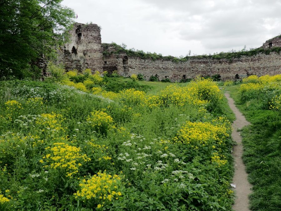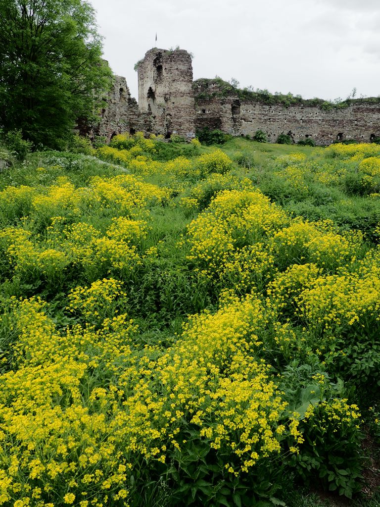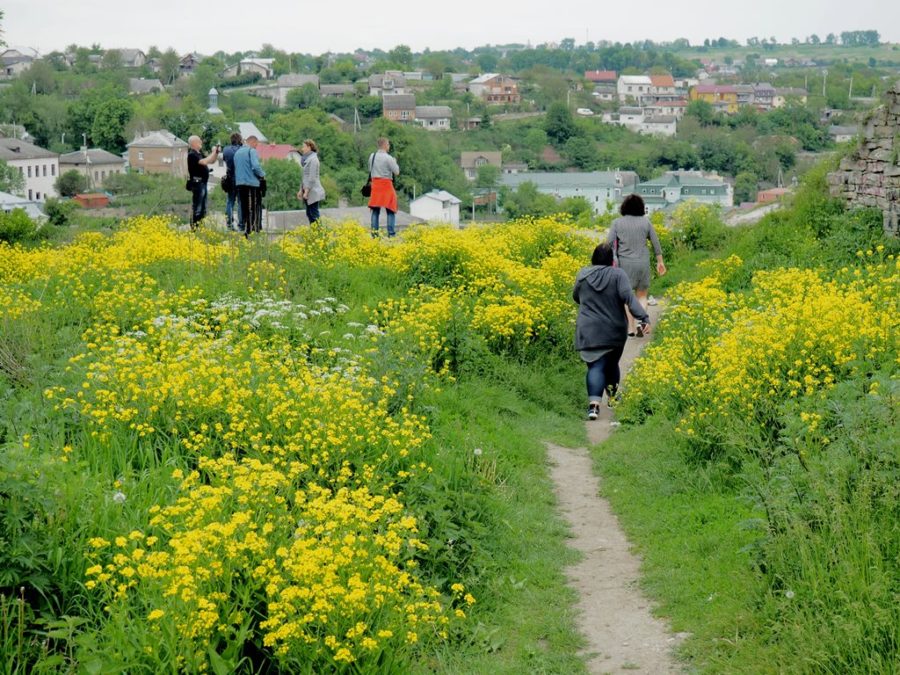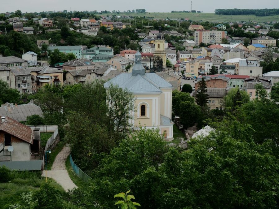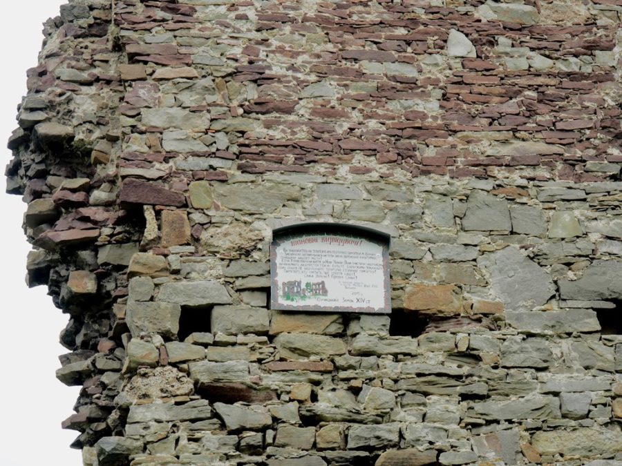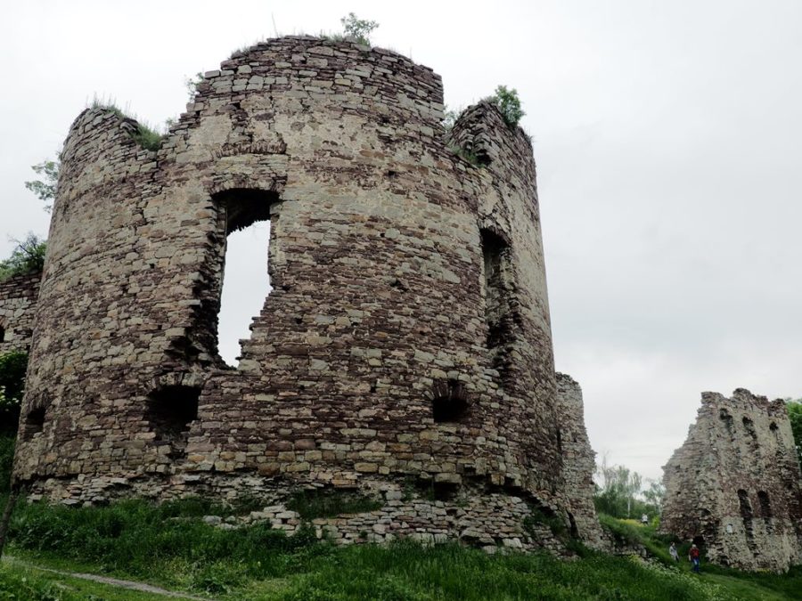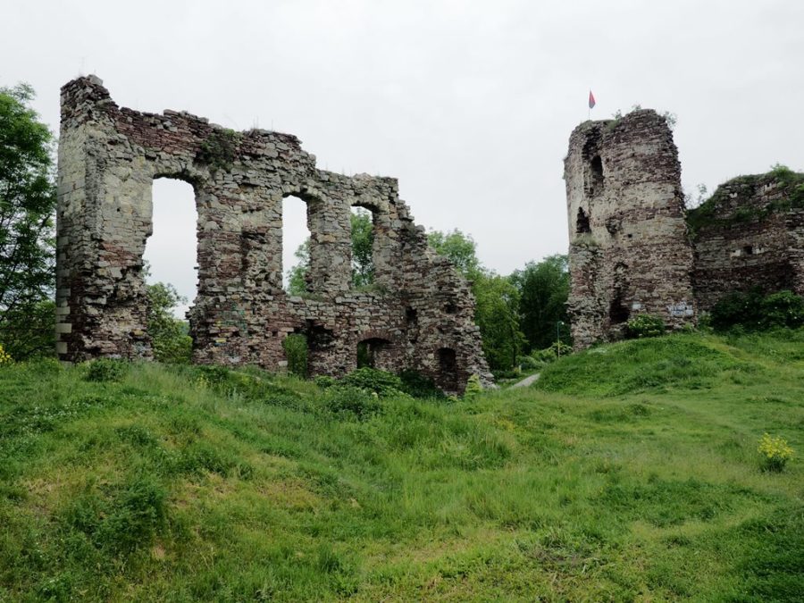 Do dziś pozostały z niego fragmenty czterometrowej grubości murów, pozostałości jednej bastei, a także ściany pałacu z otworami okiennymi. Na wzgórze zamkowe wstęp jest wolny, można tu dojść dróżką od kościoła, albo od lipy, pod którą podpisano haniebny traktat (piszę o niej osobno). Roztacza się stąd bardzo ładny widok na położone w dolinie Strypy miasto z dominującymi nad nim wieżami ratusza, kościoła parafialnego pw. Wniebowzięcia Najświętszej Marii Panny i cerkwi bazylianów p.w. Podwyższenia Krzyża Świętego. Wiosną uroku ruinom dodawały kwitnące żółto kwiatki.