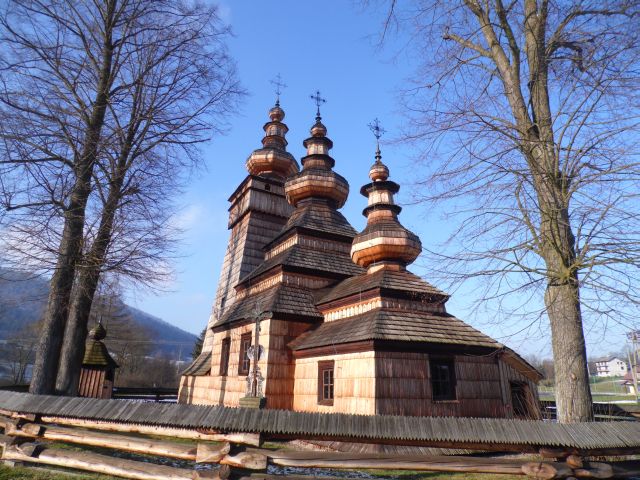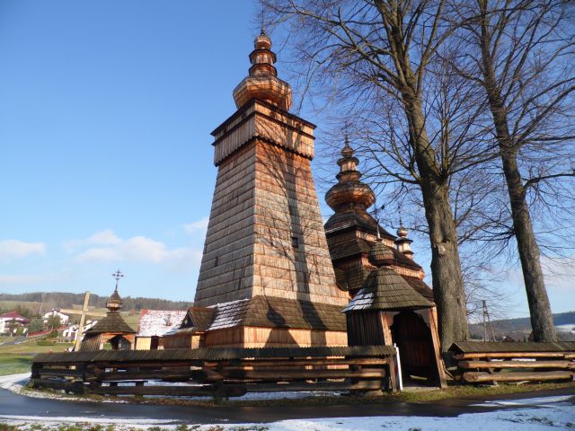 Jenak cerkiew najbardziej wyróżnia się urodą. Drewniana, kryta gontem z trzema baniastymi kopułami. Bogate jej wyposażenie pochodzi z XVII-XX w. i jest utrzymane w stylistyce późnego baroku. Ikonostas został wykonany w latach 1903-04 przez malarza Michała Bogdańskiego oraz rzeźbiarza Andrzeja Szajnę. We wnętrzu, oprócz ikonostasu uwagę przykuwa polichromia 1811 roku oraz malowidła imitujące kolumny i gzymsy. Wyróżnia się także cennym znaleziskiem. Podczas ostatniego remontu w 2012 r. na parapecie chóru odkryto ikonę sprzed 400 lat z Chrystusem Pantokratorem, zamalowaną kwiatowym ornamentem. Potwierdzeniem unikatowej wartości cerkwi jest wpisanie jej w 2013 r. na Listę Światowego Dziedzictwa UNESCO.