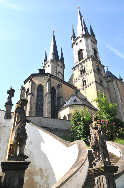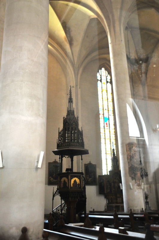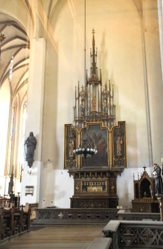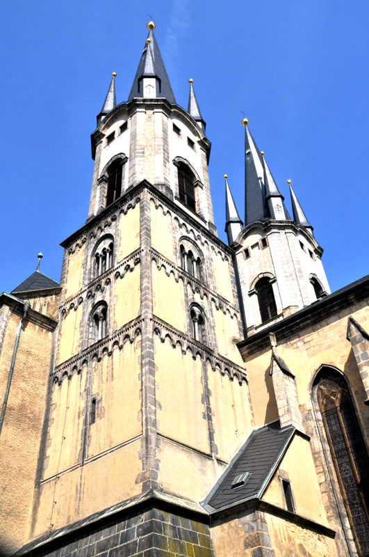 Farę zbudowano jako trójnawową bazylikę romańską, z której do naszych czasów zachowały się tylko dolne części obu wież oraz piękny portal zachodni. Po pożarze miasta w 1270 r. dawną absydę kościoła zastąpiło wczesnogotyckie prezbiterium. Dobudowano też zakrystię i chór. Gruntowna przebudowa tej świątyni nastąpiła w połowie XV w., gdyż nie odpowiadała ona już aspiracjom tutejszego bogatego mieszczaństwa. Dokonali jej w latach 1455-1476 mistrz Jőrg z Chebu, a później Erhard Bauer z Eichstädtu. Powstała monumentalna trzynawowa świątynia z 14. ołtarzami, długa na 50, szeroka na 30 i wysoka na 26 m. Wnętrze malowidłami ozdobił malowidłami mistrz Łukasz z Norymbergi. W połowie XVIII w. obie wieże fary otrzymały barokowe hełmy, zmieniane po kolejnych pożarach i klęskach żywiołowych. W kwietniu 1945 r. wieże te zostały zburzone podczas alianckiego nalotu i odbudowane dopiero w roku 2008. Z najstarszego okresu dziejów tej świątyni zachowało się niewiele. Poza już wspomnianymi, także romańska chrzcielnica oraz sanktuarium w prezbiterium oraz sześć gotyckich rzeźb w bocznych ołtarzach z końca XV w.