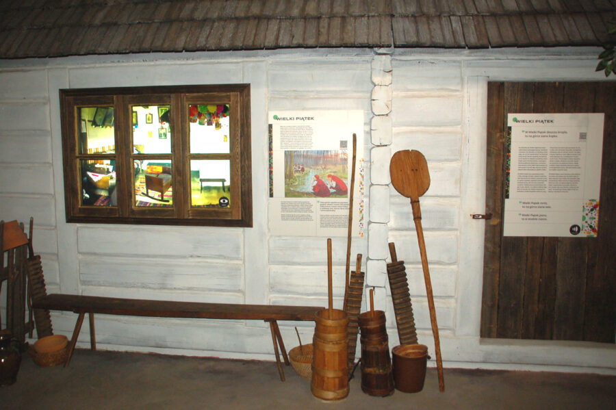 Oglądamy przydomowy ogródek ogrodzony tradycyjnym płotem z nierównych prętów i soczystą w nim zieleń. Oparte o ścianę domu narzędzia rolnicze, widły, grabie czy drewnianą łopatę do chleba i świątecznych ciast. Drewnianą maselnicę, beczki oraz suszące się na szczeblach płotu gliniane garnki. Czytamy ilustrowaną informację o Niedzieli Palmowej, podobną o Wielkim Piątku. A przez okna chaty widzimy co dzieje się w jej wnętrzu.