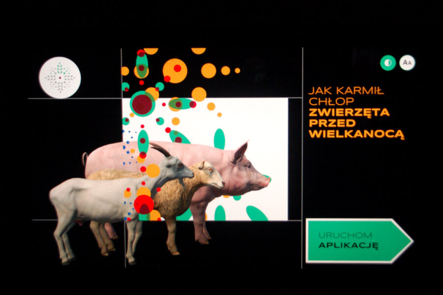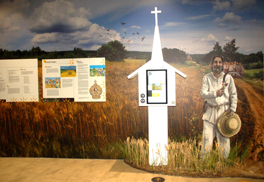 I to dosłownie. Oglądamy, słyszymy dźwięki zarówno podkładu muzycznego, jak i tego co dzieje się w tle: kos i sierpów ścinających zboże, gdaczących kur i kwaczących kaczek, odgłosy z obór i chlewów, różnych prac polowych i domowych. Oczywiście również kościelne dzwony czy pieśni, modły itp. Nie tylko oglądamy i słyszymy, ale możemy poczuć zapachy. Wystarczy otworzyć odpowiednio oznaczone pojemniczki, podnieść je do nosa i wciągnąć znajdujący się w nich zapach: tradycyjnych obrzędów religijnych i świeckich, prac polowych, wiejskiej kuchni, kwitnących drzew, obory czy chlewu.