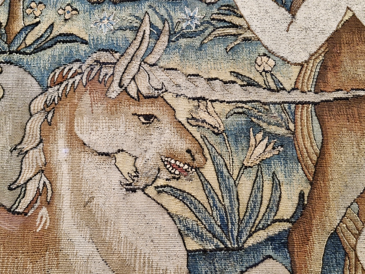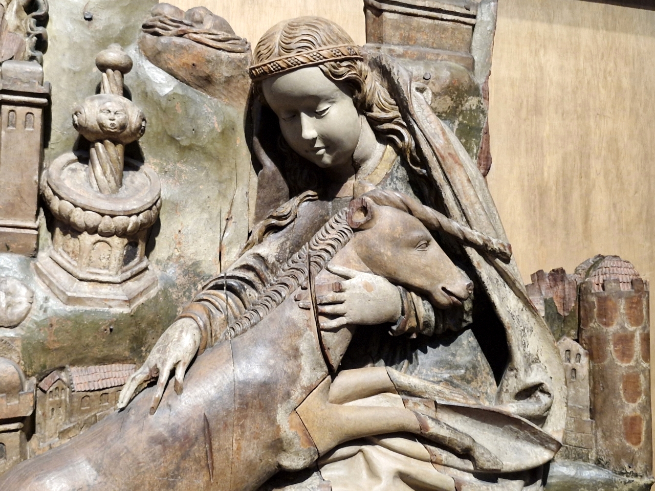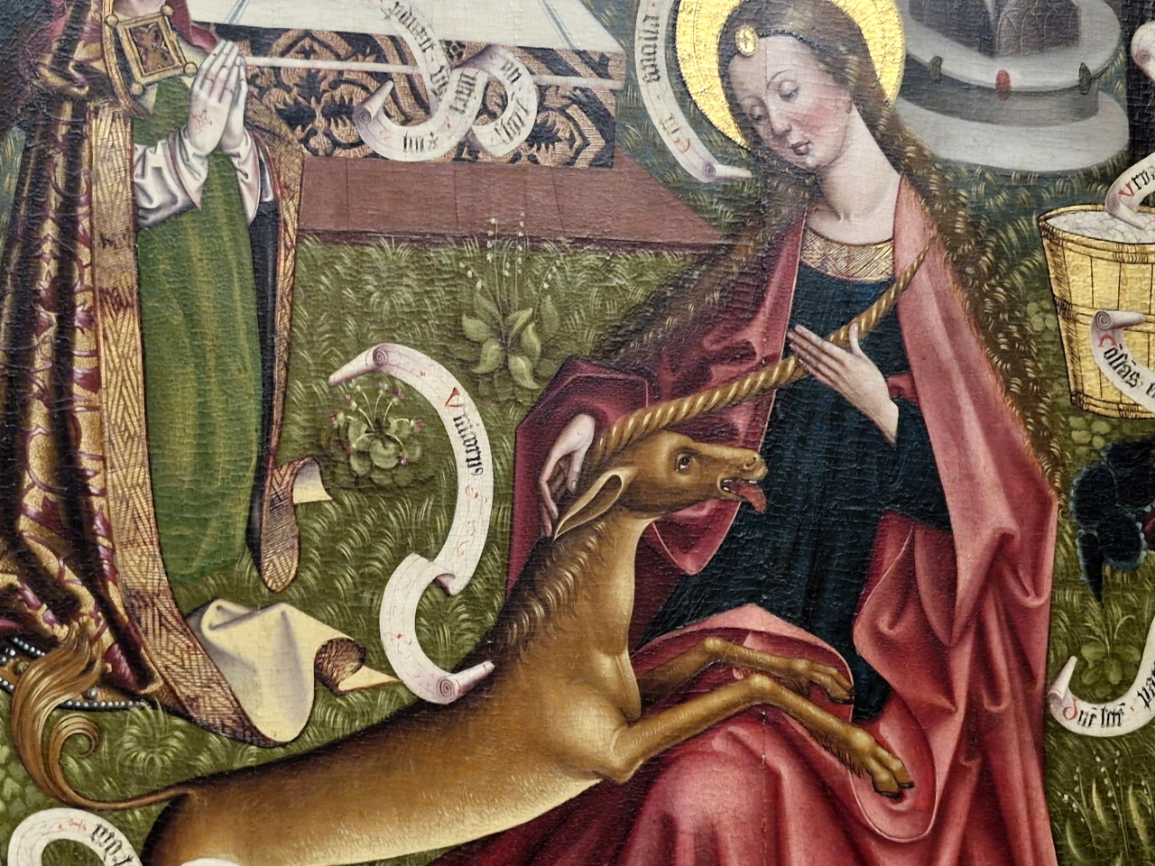 To wówczas narodził się motyw jednorożca jako czułego kochanka, którego miłość czyni bezbronnym. Oddaje się dziewicy z pokorą, wdziękiem i ufnością. Te przedstawienia są niezwykle intymne wręcz zmysłowe. Jednorożec jest wrażliwy na muzykę, na dźwięk i wydaje się, że gdy patrzymy na te przedstawienia słyszymy melodię. Miłosny motyw, który w tradycji chrześcijańskiej przenosi się na symbolikę religijną – maryjną. Jednorożec pojawia się szczególnie w ikonografii Zwiastowania z wyobrażeniem Chrystusa. Tu jednorożec porównywany był do Jezusa. Na jednym z dwuczęściowych obrazów biblijny Adam spotyka Boga, który powyżej wyjmuje z żebra śpiącego Adama Ewę. A oto Maryja w ogrodzie rajskim pełnym kwiatów i poziomek. Zrywa je każdego roku, jako owoc pojawiający się plennie i corocznie. Przedstawienia łączą symbolikę świecką i świętą, w której obok Maryji i jednorożca pojawiają się inne zwierzęta – pies, lew, jeleń, a wśród roślin irysy i lilie.