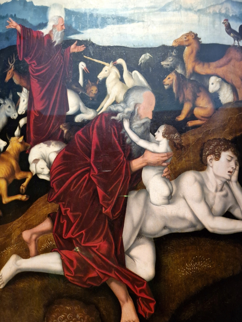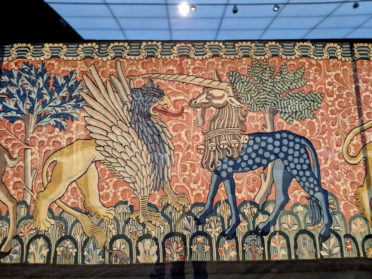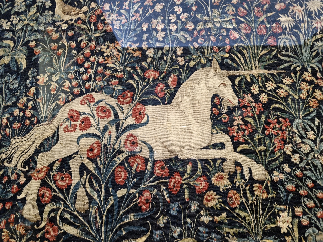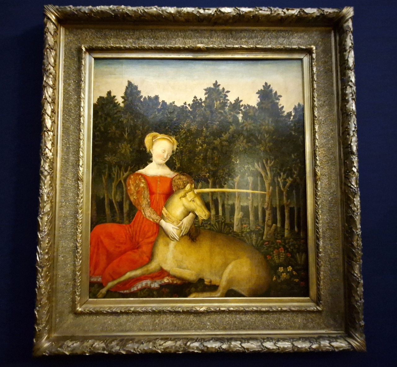 To wówczas narodził się motyw jednorożca jako czułego kochanka, którego miłość czyni bezbronnym. Oddaje się dziewicy z pokorą, wdziękiem i ufnością. Te przedstawienia są niezwykle intymne wręcz zmysłowe. Jednorożec jest wrażliwy na muzykę, na dźwięk i wydaje się, że gdy patrzymy na te przedstawienia słyszymy melodię. Miłosny motyw, który w tradycji chrześcijańskiej przenosi się na symbolikę religijną – maryjną. Jednorożec pojawia się szczególnie w ikonografii Zwiastowania z wyobrażeniem Chrystusa. Tu jednorożec porównywany był do Jezusa. Na jednym z dwuczęściowych obrazów biblijny Adam spotyka Boga, który powyżej wyjmuje z żebra śpiącego Adama Ewę. A oto Maryja w ogrodzie rajskim pełnym kwiatów i poziomek. Zrywa je każdego roku, jako owoc pojawiający się plennie i corocznie. Przedstawienia łączą symbolikę świecką i świętą, w której obok Maryji i jednorożca pojawiają się inne zwierzęta – pies, lew, jeleń, a wśród roślin irysy i lilie.