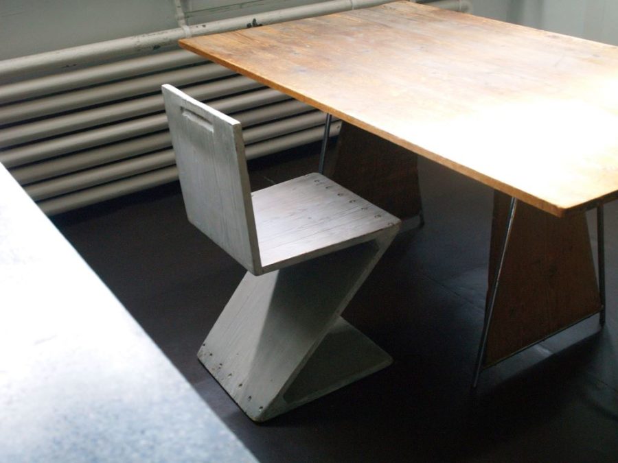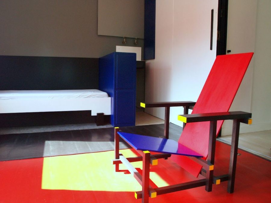 W 1917 r. Gerrit Rietveld wykonał pierwszą wersję swojego słynnego krzesła, wersję monochromatyczną w naturalnym kolorze drewna dębowego. Krzesło składające się z 15 listew i dwóch prostokątnych paneli, w 1919 r. pokryte zostało barwnymi lakierami w trzech podstawowych kolorach żółtym, czerwonym i niebieskim, barwami neoplastycyzmu. To krzesło stało się artystyczną wizytówką Gerrita Rietvelda, będąc zmaterializowaną w rzeźbie przestrzennej ideą kompozycji koloru, formy i przestrzeni. Jest ikoną dizajnu.