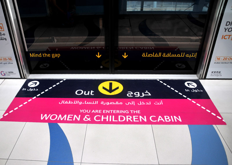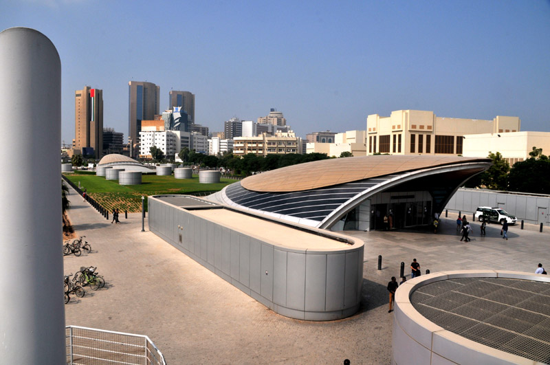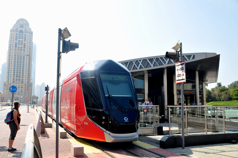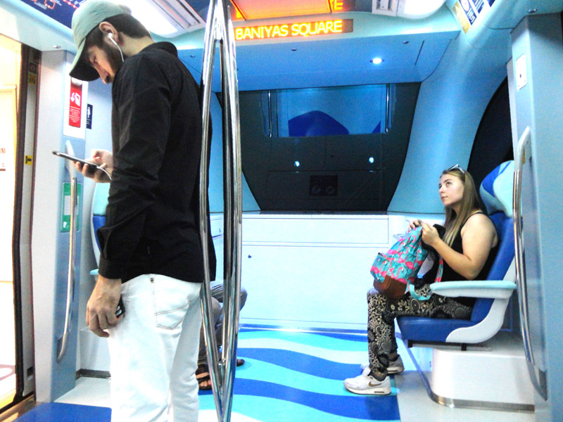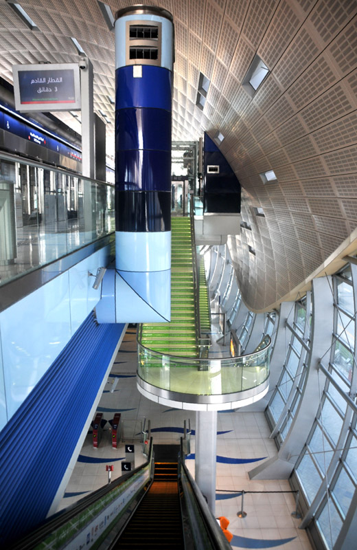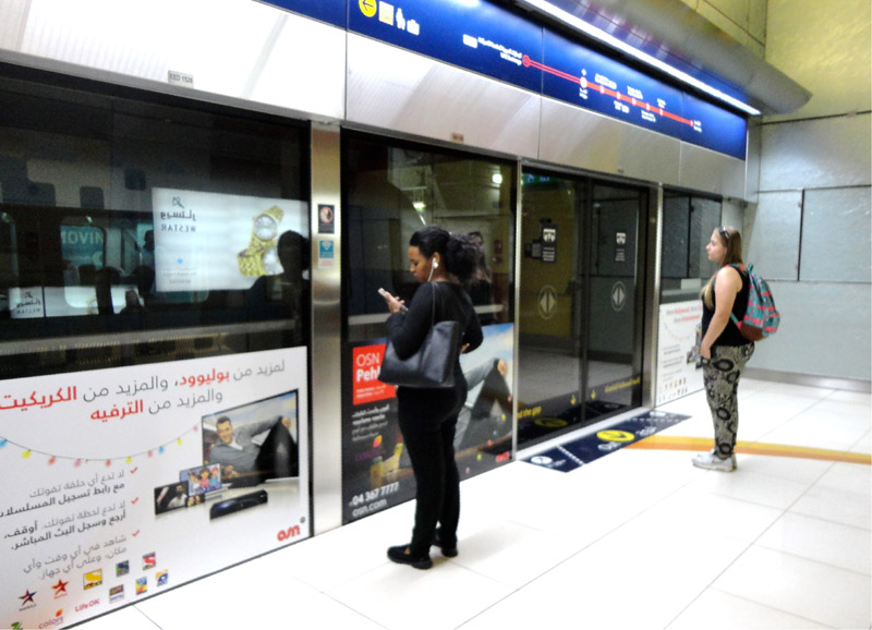 * czerwoną, którą można dojechać z Rashidii, dwu terminali Dubai International Airport oraz dzielnicy Deira, aż niemal na sam południowo ? zachodni kraniec miasta do UAE Exchange, w rejon przyszłej Wystawy Światowej EXPO Dubaj 2020,