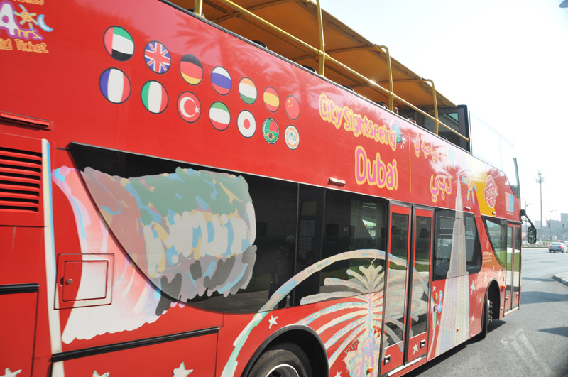 Dubaj poznawać można na różne sposoby. Dobrym wstępem może być skorzystanie z jednej z kilku objazdowych linii turystycznych. Jeżdżą na nich piętrowe autobusy, przy czym na górnym poziomie przynajmniej połowa jest bez okien, lub nawet dachów. Co zapewnia optymalne warunki dla robienia zdjęć, ale równocześnie jazdę w upale, powalającym zwłaszcza w miesiącach letnich. Autobusy te zatrzymują się w najbardziej znanych i polecanych miejscach. Np. jedna z najpopularniejszych linii ma cztery trasy dzienne: Dubaj historyczny, nowoczesny, nadmorski i po palmowej wyspie. W sumie 40 przystanków oraz informacja w 13 językach. Nie ma jednak wśród nich polskiego. Można kupić bilet jednorazowy w cenie 145 drahm (AED, aktualnie ponad 170 zł), dzieci w wieku 5-15 lat 75 AED, lub rodzinny: dwoje dorosłych i dwójka dzieci, 365 AED. Dla tych turystów, którzy chcą zobaczyć więcej, wsiadać i wysiadać do kolejnych autobusów tej linii w ciągu 24, 48 lub 72 godzin, są bilety 1-3 dobowe. W cenie od 240 (dzieci 100, rodzina 580) do 340 AED (dzieci 170, rodzina 850). Linia ta proponuje również dwie, krótsze trasy nocne.