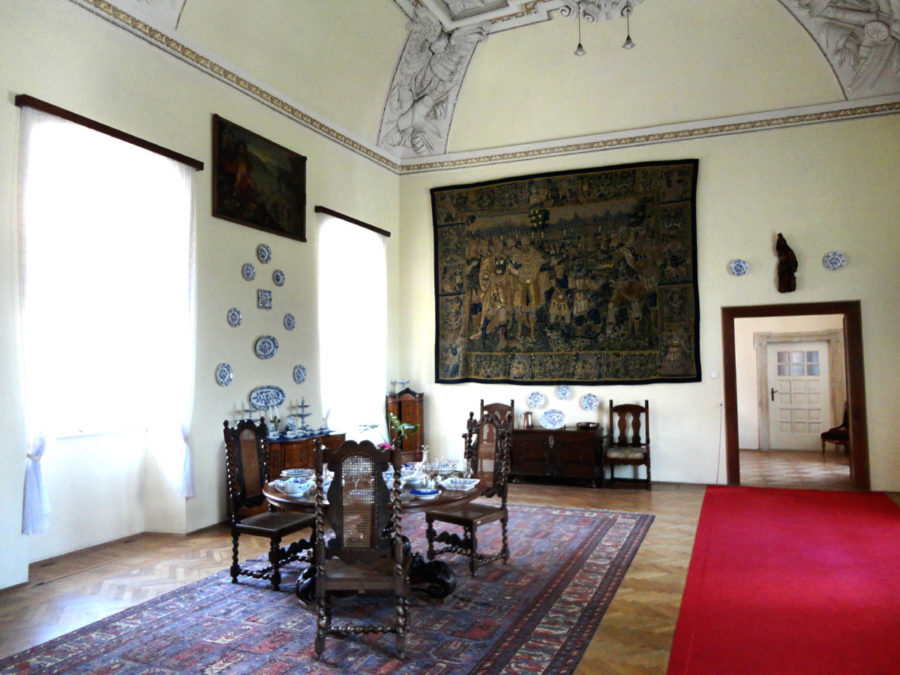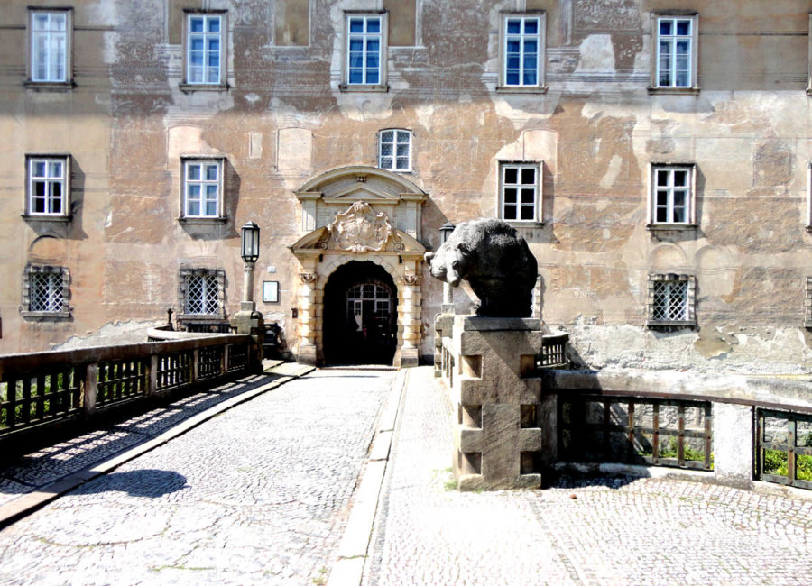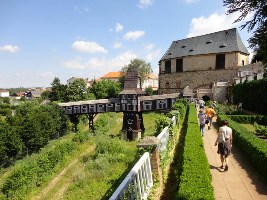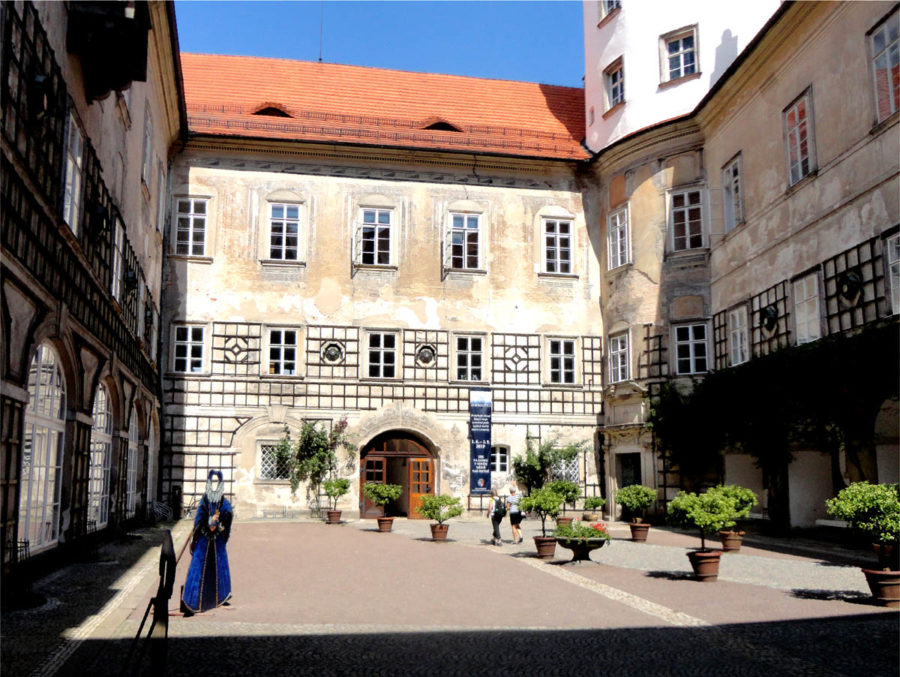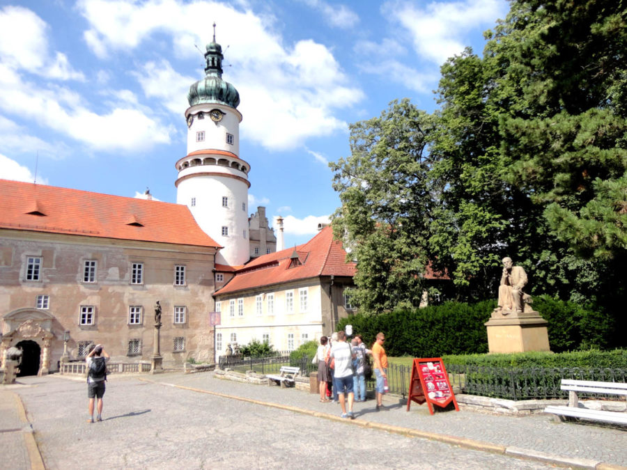 Ma on ciekawą historię, dosyć niezwykłe wnętrza oraz bogate, zabytkowe wyposażenie. Oprowadza nas po nim jego zarządca (správce zámku) Ondřej Danĕk. To dwupiętrowa, rozległa budowla ze stromym dachem pokrytym czerwoną dachówką, wysoką wieżą z barokowym, hełmem i latarnią oraz niższą narożną. Stoi na skraju skalnej ostrogi nad rzeką, a równocześnie w północno-zachodniej części tutejszej starówki, będącej miejskim rezerwatem historycznym. Pięknie widać ją z punktu widokowego Dvořáčka na przeciwległym brzegu Metuji, od strony zamkowych ogrodów, ale również z placyku przed jego frontową fasadą. A w panoramie całej starej części Nowego Miasta, z trochę bardziej odległego punktu widokowego Juránka (Juránkova vyhlídka).