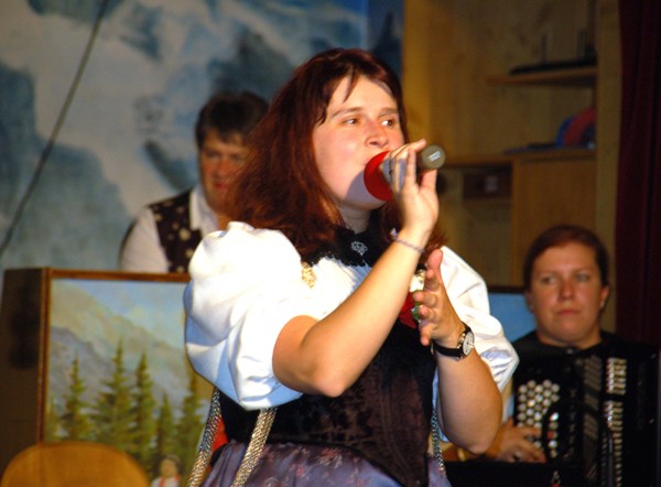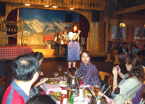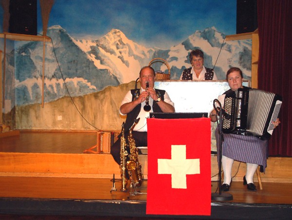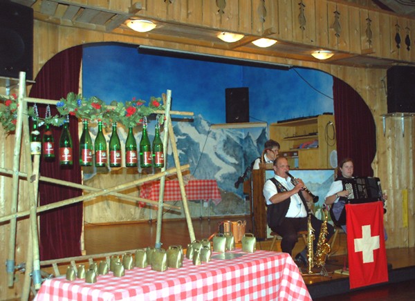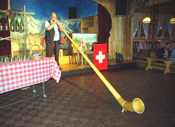Schweizer Folklore Show w języku angielskim rozpoczął się wkrótce po podaniu wina i sałatek. Początkowo banalnie. Na tle ogromnego zdjęcia Alp z, oczywiście, Dziewicą, Mnichem i Eigerem na pierwszym planie i za szwajcarską flagą zaczęło grać trio w ludowych strojach. Harmonistka, wykonawczyni na niewidocznym, zasłoniętym instrumencie oraz multiinstrumentalista z klarnetem, fletem, saksofonem i czymś tam jeszcze.