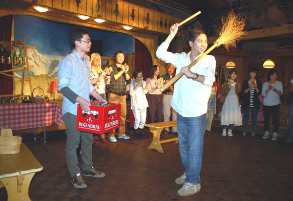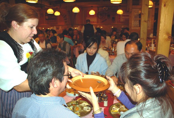 Ale w przerwach między poszczególnymi punktami programu do uczestnictwa w nim zapraszani byli biesiadnicy. Chińczycy w różnym wieku próbowali, z różnym skutkiem, dąć w róg. Wszystkich, moim zdaniem, łącznie z członkiem tego szwajcarskiego zespołu folklorystycznego pobiła na głowę młoda Chinka wydobywając z instrumentu niesamowite, bardzo melodyjne dźwięki. Inni próbowali sił w grze na miotle lub wydobywaniu dźwięków z glinianych mis poruszając kręconymi w nich monetami. No i tańcu. Zabawa była przednia, oklaskom i brawom nie było końca.