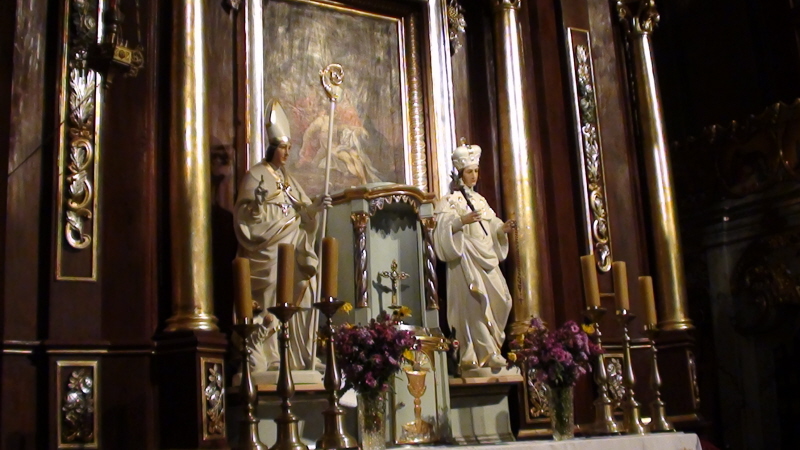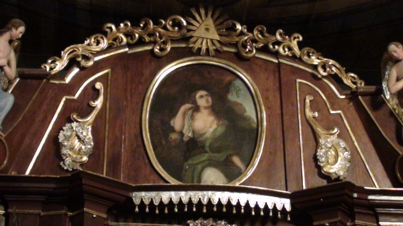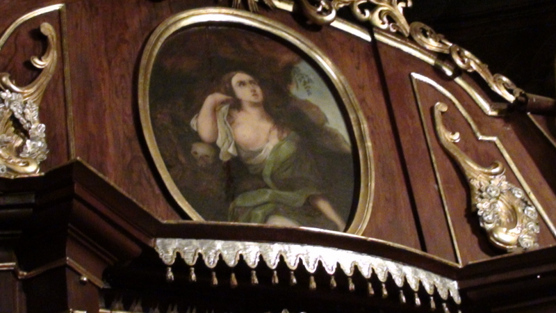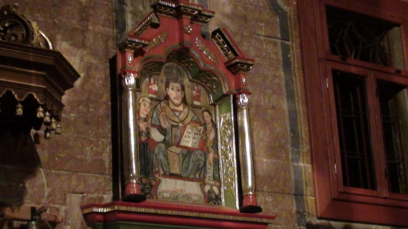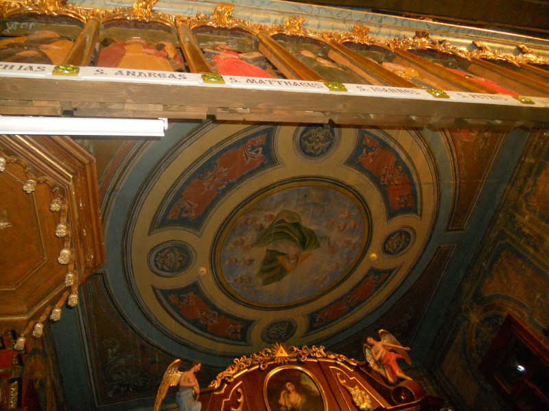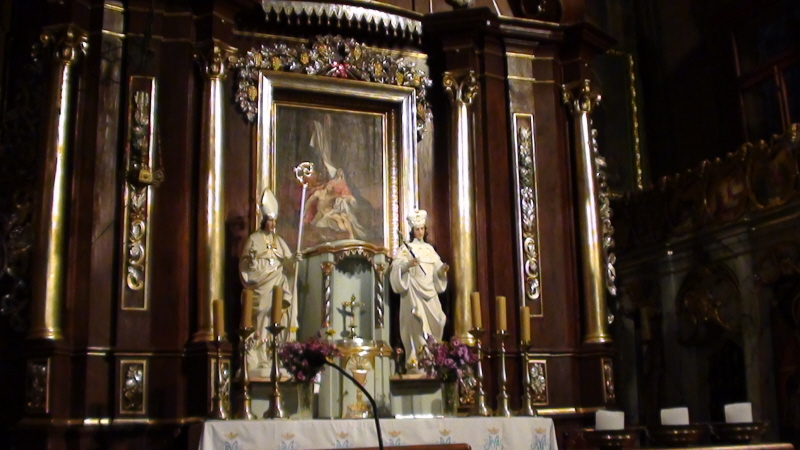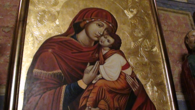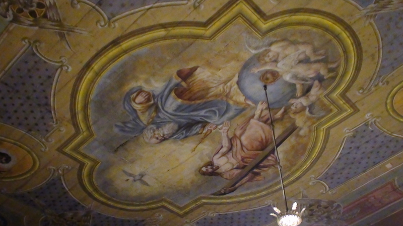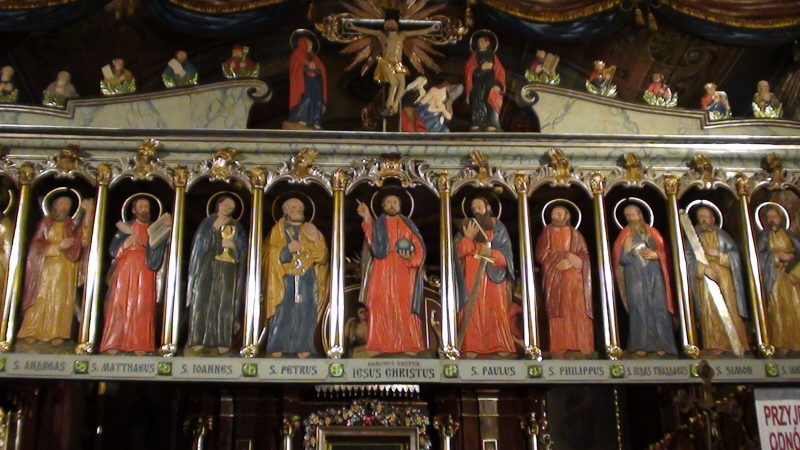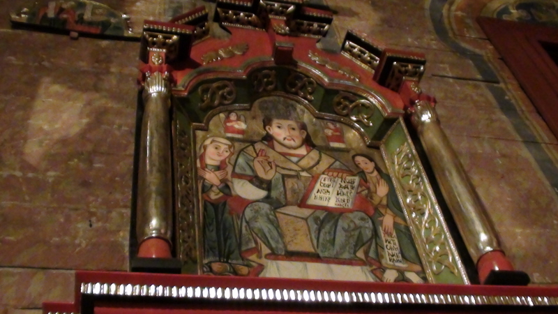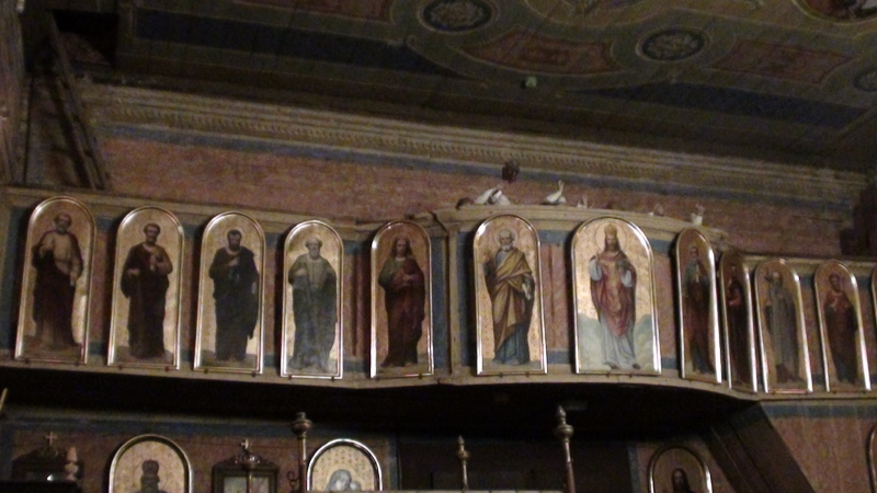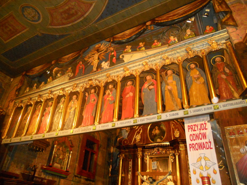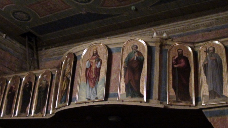 W przedsionku wzrok pada na pięknie zdobione figury płaskorzeźbione. Są one ułożone w rzędzie na ścianie. To części unikatowego ikonostasu, jakie zdarzają się tylko w Rosji. Wszystkie postaci były wycięte z deski, rzeźbione i polichromowane. Najprawdopodobniej pochodzą one z pierwszej połowy XVIII wieku. Legenda mówi, że miejscowy artysta wyrzeźbił ikonostas z jednego wielkiego pnia lipowego, przyniesionego przez wezbrane wody Wołkowyjki. W 1912 roku ikonostas został zakwestionowany przez biskupa jako niekanoniczny. Według władz kościelnych ikonostas powinien się składać z ikon malowanych (pisanych) według ściśle określonych reguł. Ten został więc rozmontowany, a jego części rozwieszono w różnych miejscach świątyni. W starym miejscu pozostała jedynie grupa Pasji i rząd proroków na belce zwieńczenia ikonostasu. I znajdują się tu do dziś.