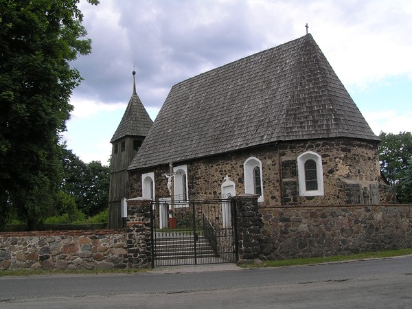 Kościół nosi wezwanie św. Wawrzyńca. Jest jednonawowy, nie ma wieży. Od zachodniej strony znajduje się jednak wolnostojąca drewniana dzwonnica, także stara – wybudowano ją w połowie XVIII wieku. Na zewnętrznej ścianie prezbiterium wmurowano ciekawe epitafia. Gotyckie obramienia drzwi i okien, pomalowane na biało, ładnie odcinają się od ciemnych kamiennych ścian. Drzwi zamknięte, nie wiem, co jest w środku. Zapewne dość pusto.
