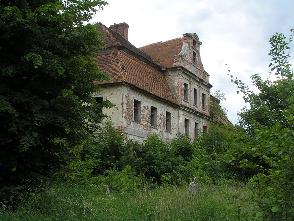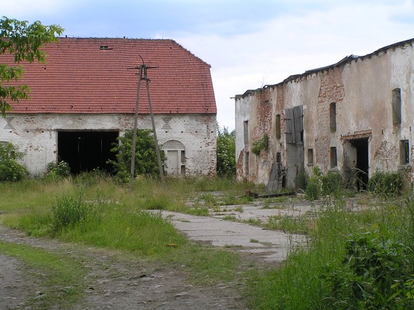 A pałac? Nie widzieliśmy po drodze. – To w pegeerze – podpowiada nam przygodny przechodzień. – Trzeba przejechać za mostek. Tak też czynimy i znajdujemy się w świecie ruin. Nie wiem, co robi gorsze wrażenie: czy ruiny pałacu, czy ruiny pegeeru… Pałac nie był użytkowany od 1945 roku, PGR zamknięto w latach 90.