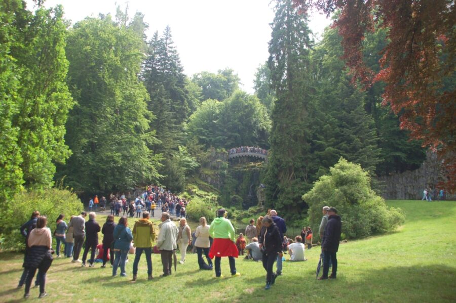 Oglądamy również kamienne budowle przypominające średniowieczne zamkowe mury na których znajdują się duże płaskorzeźby, czy „Most Diabła”(Teufelsbrücke) rozpięty nad wodospadem między skałami, wypełniony tłumem ludzi oglądających z góry spadającą pod nim wodę. Wszystkie atrakcje wodne, działają tu na zasadzie naturalnej inercji wody. W pobliżu stoi „Zamek Lwa” (Löwenburg) zbudowany na przełomie XVIII i XIX w, będący repliką średniowiecznej gotyckiej warowni. W innym miejscu parku można zobaczyć klasycystyczną świątynię Apolla, nazywaną też świątynią Jussowa od nazwiska jej architekta.