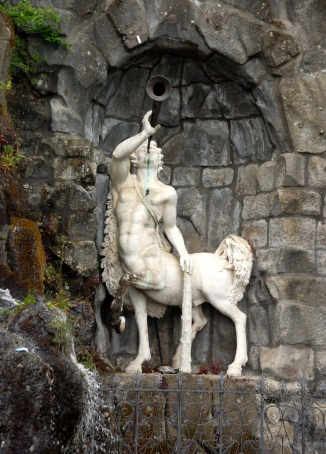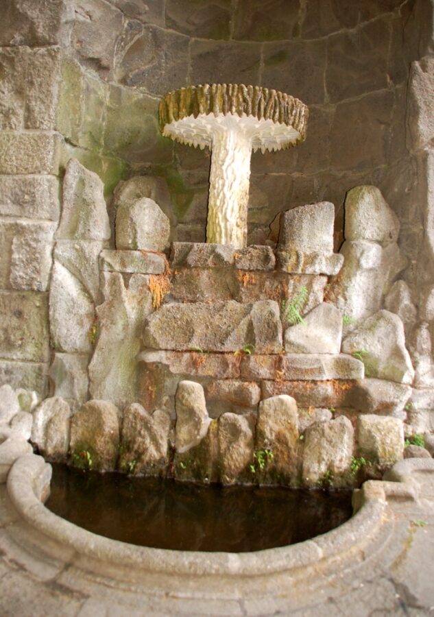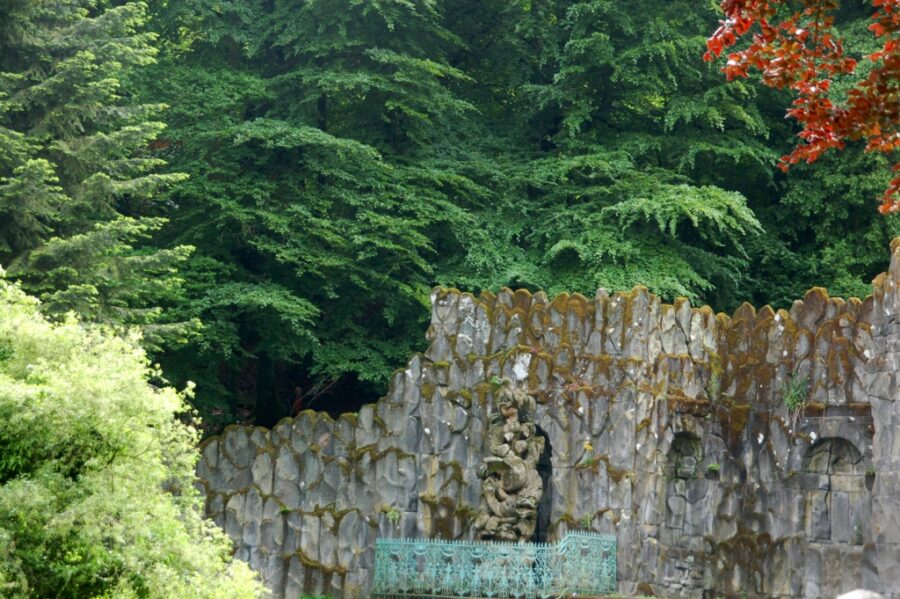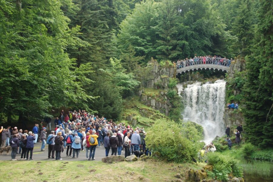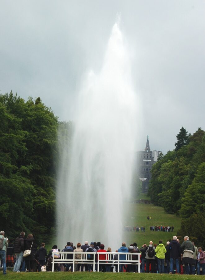 Wielkim, oczekiwanym przez tłum widowiskiem, jest wysoki wytrysk potężnego, szerokiego strumienia wody fontanny w pobliżu zielonej łąki. Na mnie jednak największe wrażenie robią wodospady, których masy wody zaczynają nagle zwalać się szczytu zamkowego muru stylizowanego na średniowieczną ruinę oraz pobliskich skał. Jest to bardzo atrakcyjne widowisko.