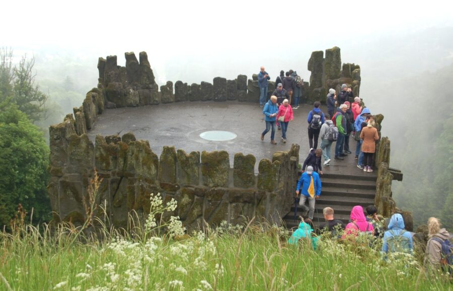 Zwiedzanie Gier Wodnych rozpoczynamy od wizyty w części recepcyjnej dla zwiedzających (Besucherzentrum Herkules), w którym znajdują się tablice informacyjne oraz sklep z publikacjami, napojami i pamiątkami. Prowadzić nas będzie przewodniczka. Pogoda jest dosyć fatalna, mgła częściowo zasłania Herkulesa i szczyt Oktagonu, którego część jest w remoncie. Ale zwiedzających mnóstwo, jest wczesne niedzielne popołudnie. Przeciskając się przez tłum schodzimy kamiennymi schodami na kolejne poziomy i platformy widokowe.
