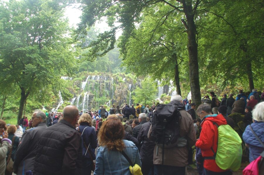 Zaczynamy od górnej części wodnych kaskad spływających w dół na długości ponad 50 m trzema kamiennymi korytami. Oglądamy najpierw z góry kolejne ich odcinki aż do sztucznego jeziorka, do którego spadają te masy wody. Później schodzimy obok kaskad, obserwując co się w nich dzieje.