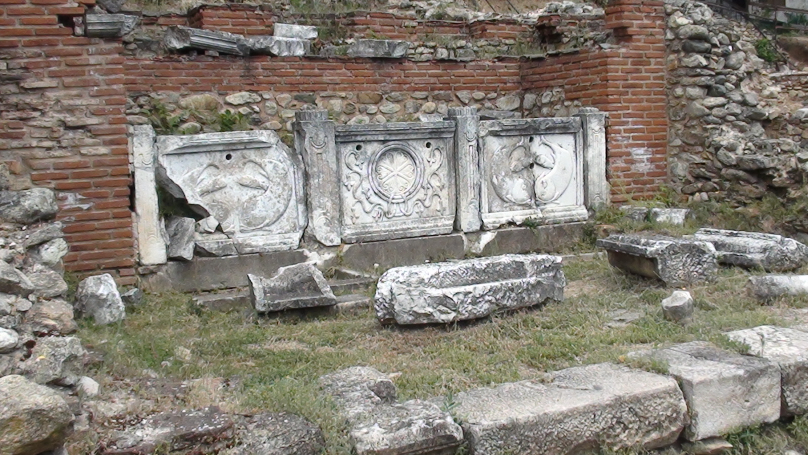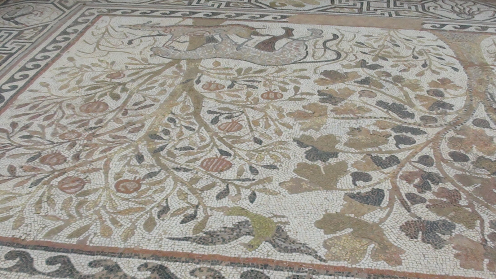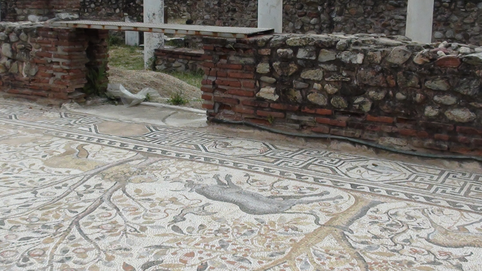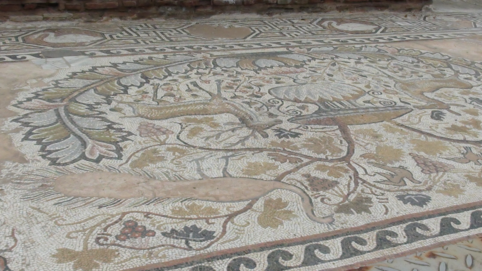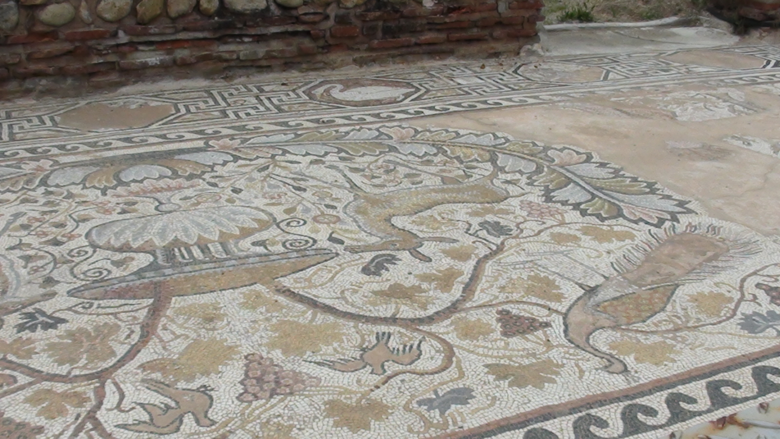 Cennym znaleziskiem są piękne mozaiki pokrywające podłogę w wielkiej bazylice. Pokryte nimi były trzy nawy. Najcenniejsze są te w narteksie.