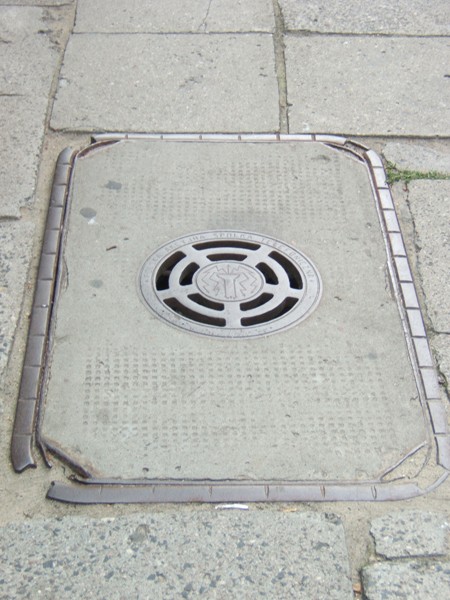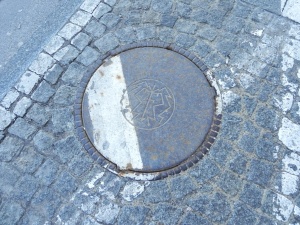 Zacząłem patrzeć pod nogi po przeczytaniu tego artykułu i rzeczywiście: jest takich studzienek trochę. Znalazłem też taką bez żadnych napisów, z samym tylko symbolem PAST-y. Oto i ona. Pod samym gmachem PAST-y.