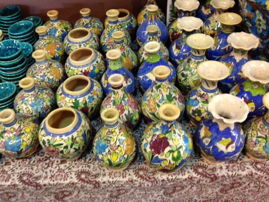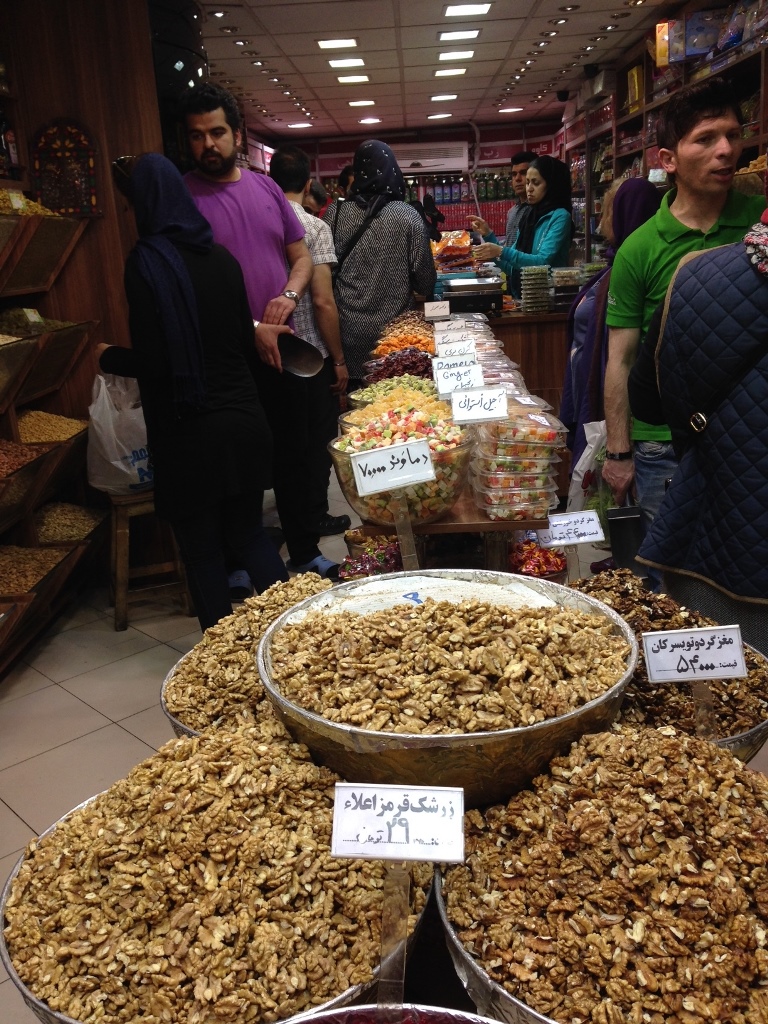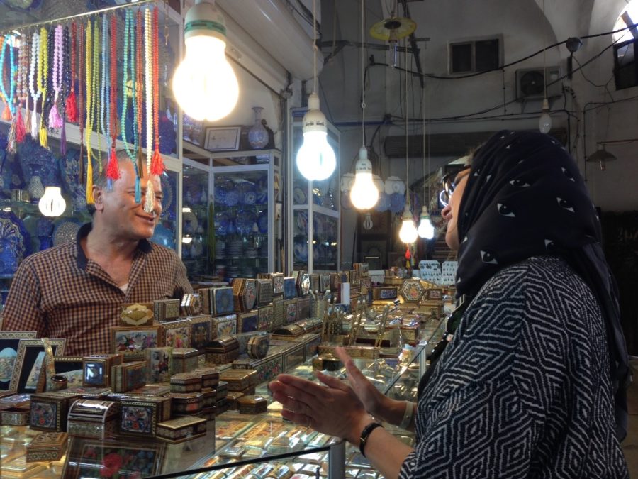 Z naszym pojęciem bazaru ten targ niewiele ma wspólnego. Bazary świata islamu – krajów arabskich czy nie arabskich, jak Iran lub Turcja, to ogromne powierzchnie, gdzie się handluje oraz wytwarza piękne przedmioty. A wiec kramy, sklepiki, sklepy i warsztaty. Praktycznie w każdym mieście warto wejść na bazar. Irańczycy zaopatrują się tu w przedmioty codziennego użytku, tkaniny, odzież oraz przyprawy, orzechy, w tym typowe tutaj orzechy pistacjowe, niezliczone ilości sałatowatych pęczków liści, które jada się tutaj na co dzień i w dużych ilościach. Szafran, powszechnie używany w tutejszej kuchni, jest pięknie eksponowany w wielkich szklanych naczyniach, ale oczywiście kupuje się go w małych pudełkach. Na bazarze możemy zaobserwować pracę rzemieślników, jak na moich zdjęciach „drukowanie” obrusów galamkar na bazarze w Isfahanie.