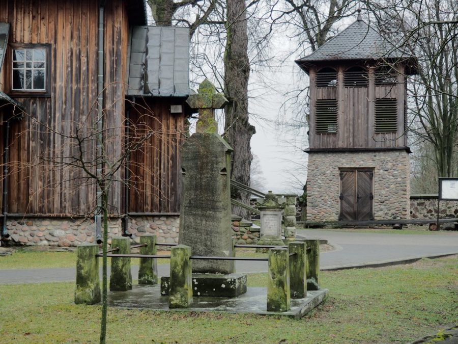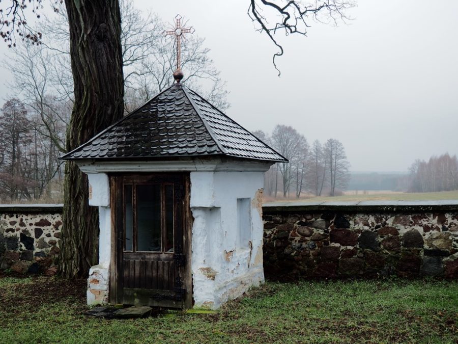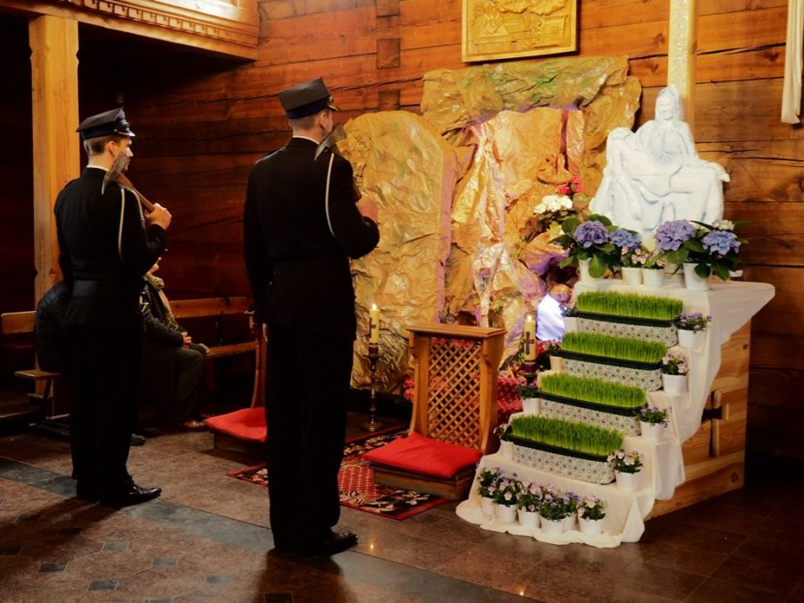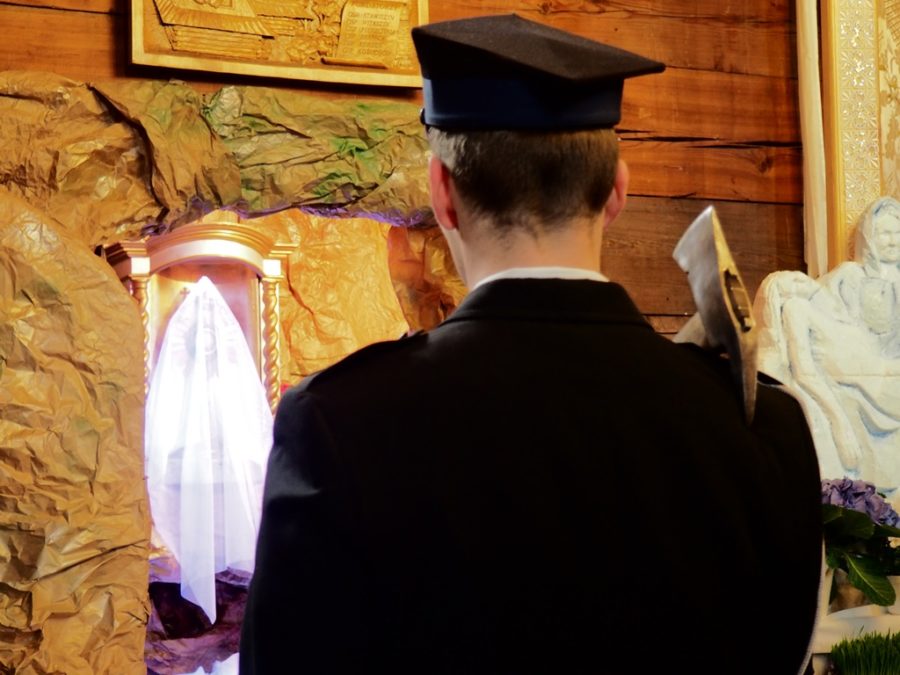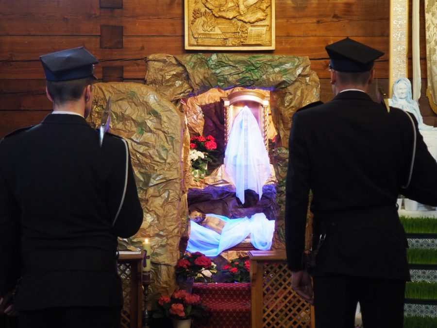 Trafiłam tu w Wielką Sobotę, a kluczem, jaki mnie tu przywiódł, było zwiedzanie instalacji Grobów Pańskich w wiejskich kościółkach i oglądanie straży. Tu wartę honorową trzymali strażacy, w galowych mundurach, w rogatywkach, z toporkami na ramionach. To członkowie Ochotniczej Straży Pożarnej z pobliskiego Witaszyna. Tak przynajmniej wynikało z napisu na samochodzie. Zaparkowali przed kościołem czerwonym służbowym żukiem. Piękny i w dobrej formie, zabytek.