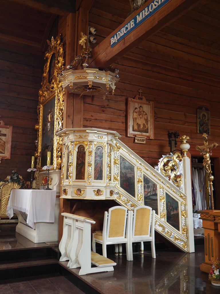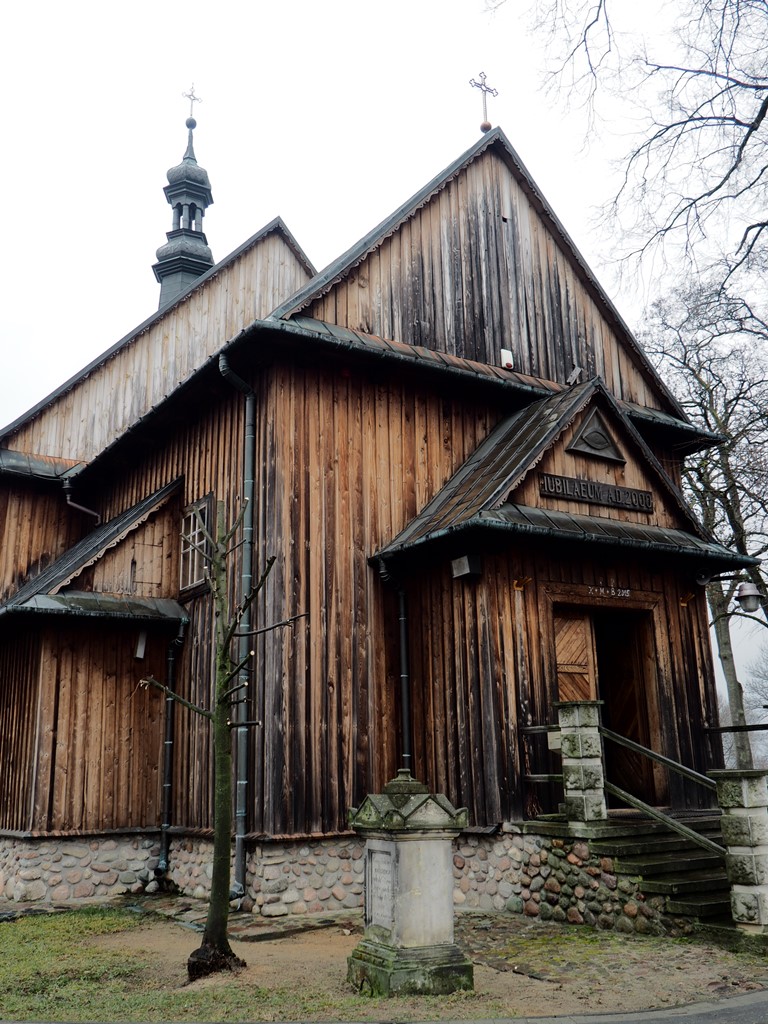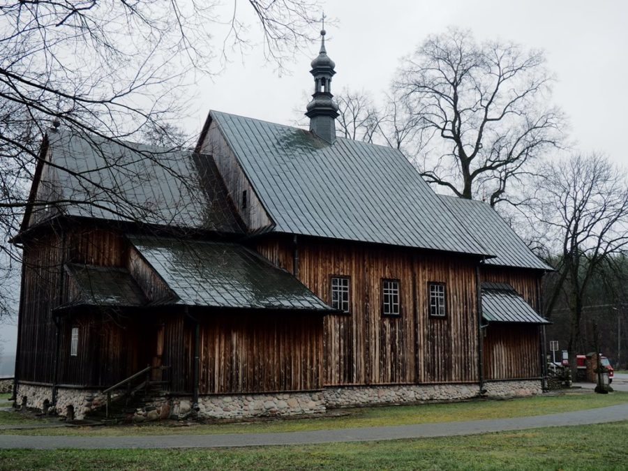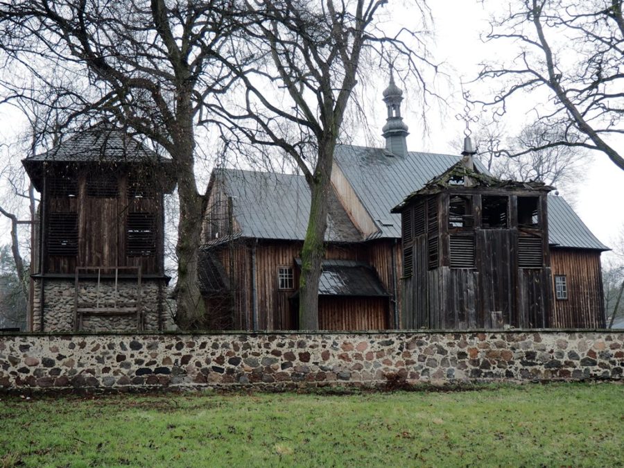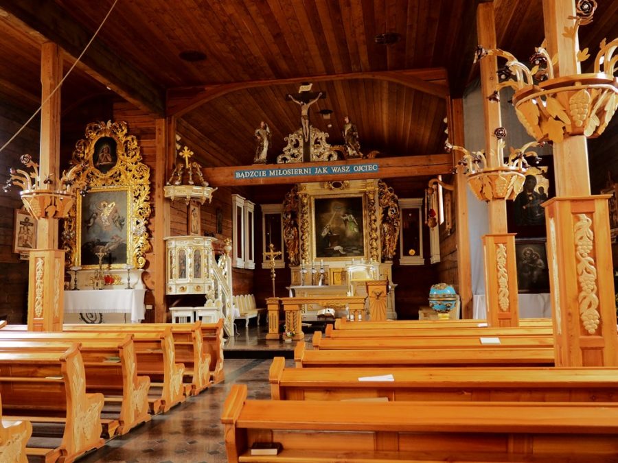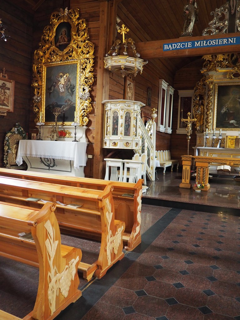 Budowla nie jest orientowana, prezbiterium zwrócone jest na północ. To rzadkie rozwiązanie. Kościół jest konstrukcji zrębowej, oszalowany. Ma sporo przybudówek i dobudówek, dach blaszany z sygnaturką. Wnętrze podzielone słupami na trzy nawy, przykryte stropem płaskim. Prezbiterium węższe, przykryte kolebkowo. Polichromia z drugiej połowy XIX wieku, wystrój w zasadzie barokowy. W zasadzie, bo ? niestety ? jest w tym wystroju trochę elementów współczesnych. Toporna snycerka lamp na filarach, toporne ławy, bardzo psują ogólne, dobre wrażenie. Nie wiem, czy konserwator zabytków nie miał tu nic do gadania?