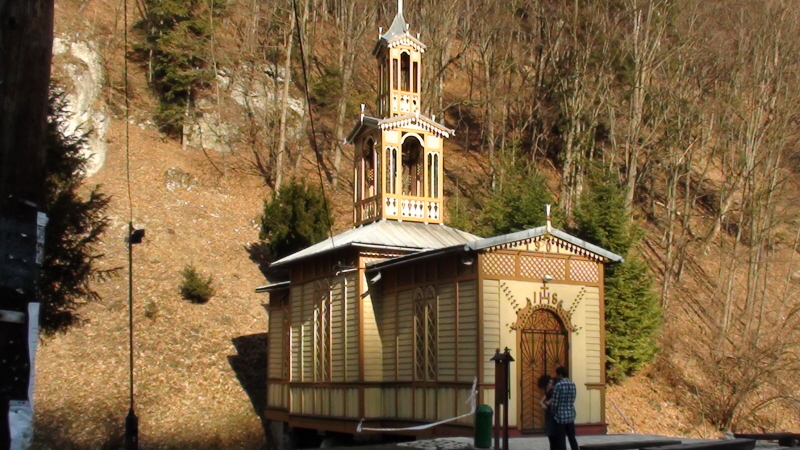 Prace rozpoczęto wiosną 1901 roku, na polance pod skałkami zwanymi Prałatkami. Wcześniej na polanie Goplana stały ojcowskie „łazienki”. Z drugim brzegiem połączono polankę drewnianym pomostem. Był to fundament dla kaplicy, zamontowany na palach wbitych w dno potoku. Szybko stanęła bryła kościoła. Jest bardzo ciekawa architektonicznie. To przykład drewnianego budownictwa stylowego opartego na miejscowych i zapożyczonych motywach zdobniczych. Styl ten nazwano szwajcarsko-ojcowskim. Kapliczkę wieńczy piękna ażurowa wieżyczka. Odnowiono ją w 1996 roku.