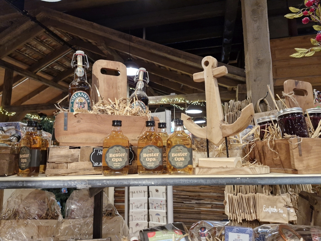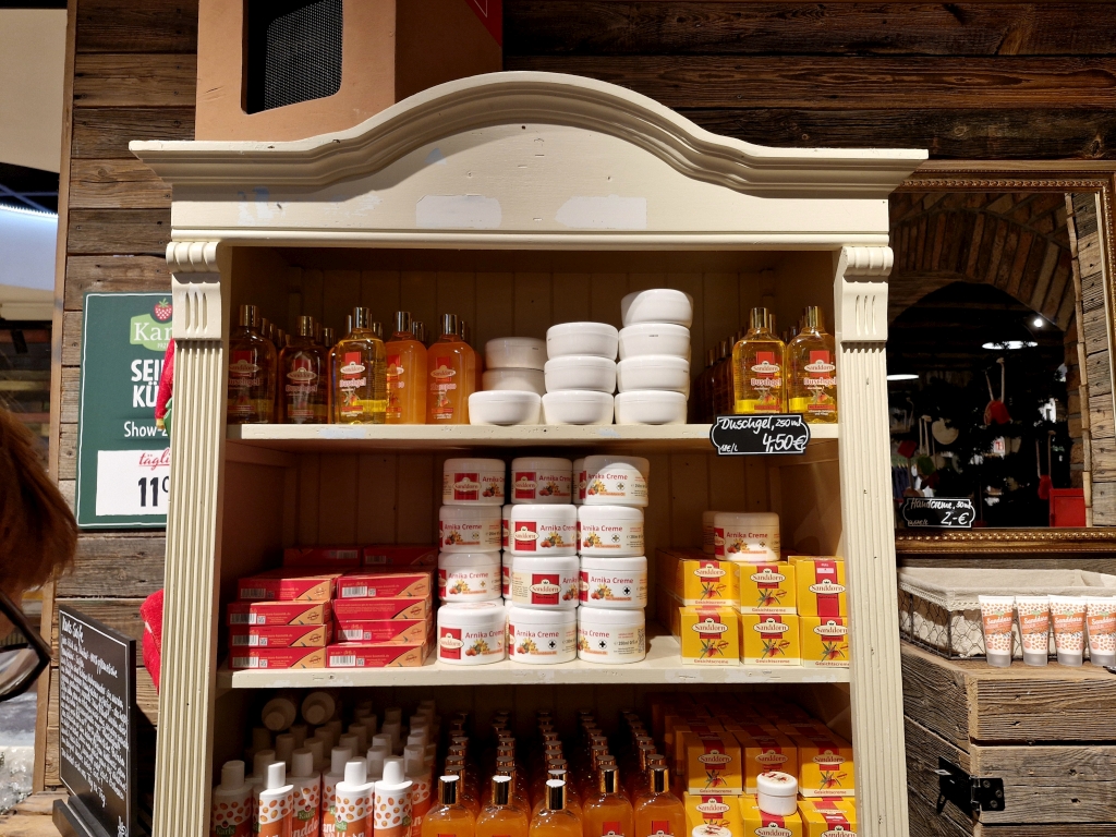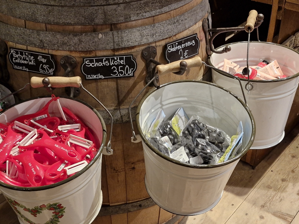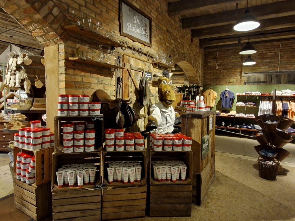 Truskawkowe marmolady z rumem, amaretto i marakują, herbaty z rokitnika (Sanddorn) i truskawkową (Erdbeer) z marcepanem oraz maść końską (Pferdesalbe) w zaułku do którego zaprasza koń.
