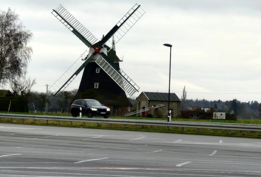 * Na polu, po przeciwnej stronie ulicy, stoi holenderski wiatrak, jak znak drogowy do Karlsa.