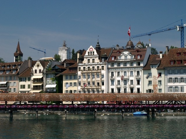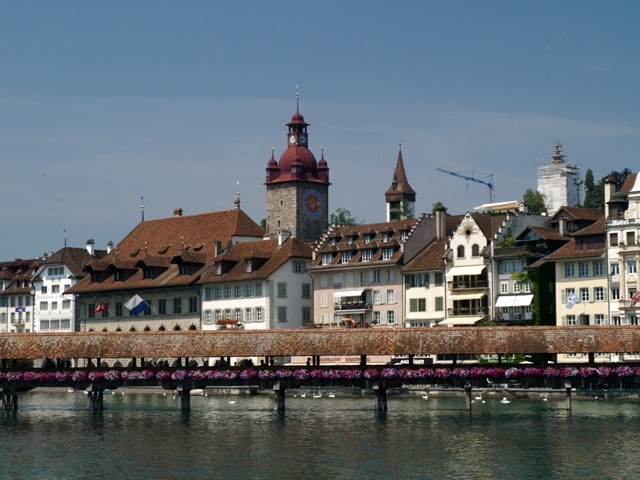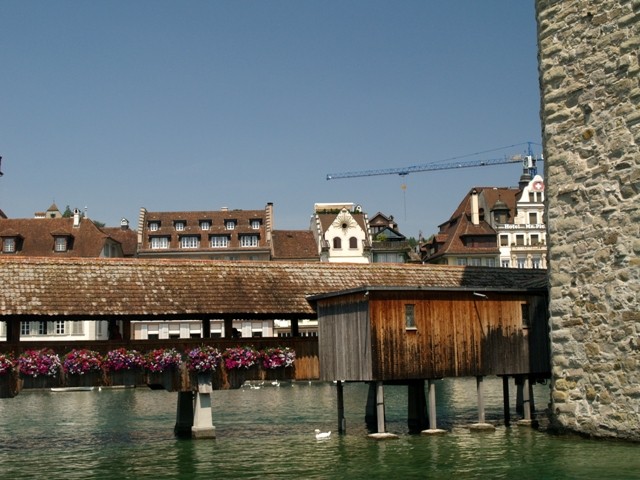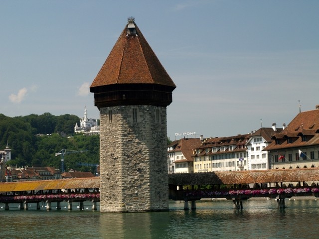 Aż się prosi, aby na przeciwległy brzeg rzeki Reuss dostać się pod dachem Kapellbrücke zwanym po prostu Mostem Lucerny. To najstarszy i najdłuższy kryty most z drewna w Europie. Połączył w 1365 roku założycielskie miasto z jej nową częścią. Był częścią szlaku dla jej mieszkańców podążających do kościoła św. Piotra i dalej do katedry św. Leodegara. Wcześniej, na środku rzeki, około roku 1300 ustawiono kamienną Wodną Wieżę (wieżę ciśnień), należącą do umocnień fortyfikacyjnych miasta. Oktogonalna wieża o wysokości 34 m służyła za strażnicę, za więzienie, za magazyn archiwalny, skarbiec, również za salę tortur. Intrygujące jest pytanie, dlaczego zlokalizowano w niej więzienie. Czy ustawiona na środku rzeki wieża było miejscem wygnania, banicji, zapomnienia, miejscem, z którego trudno uciec, z którego nie słychać jęków i błagania o litość…