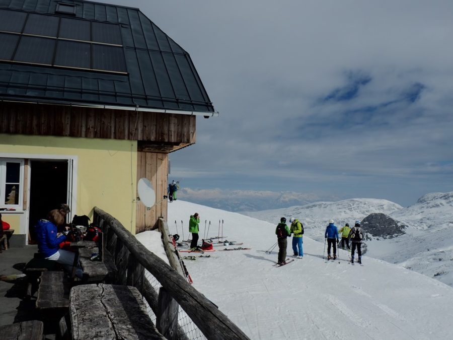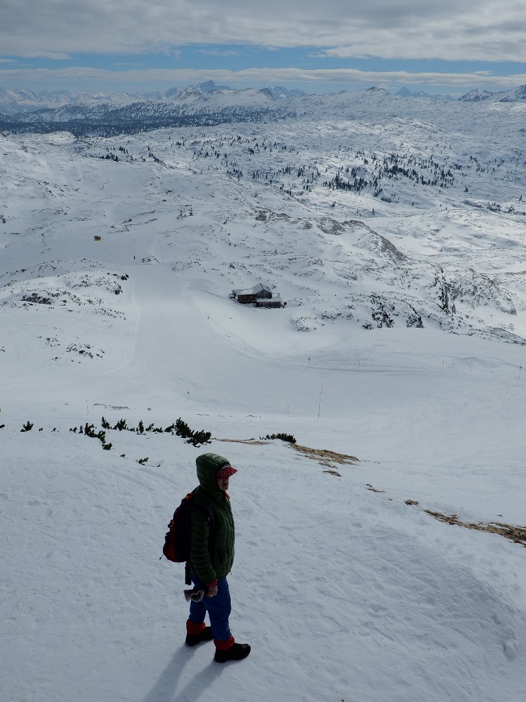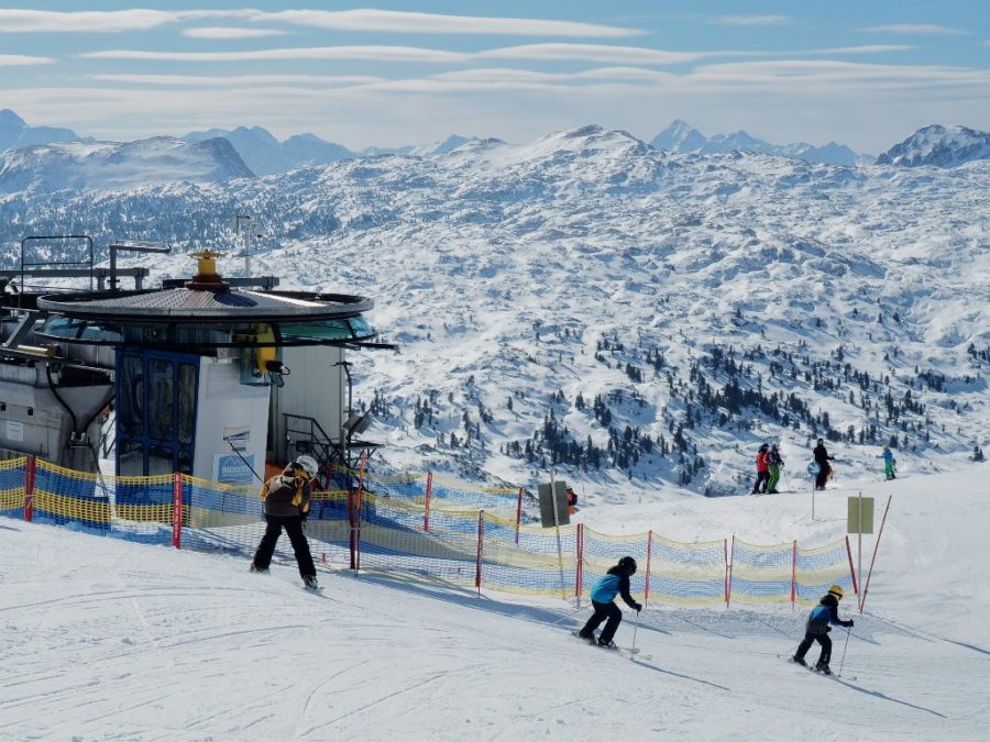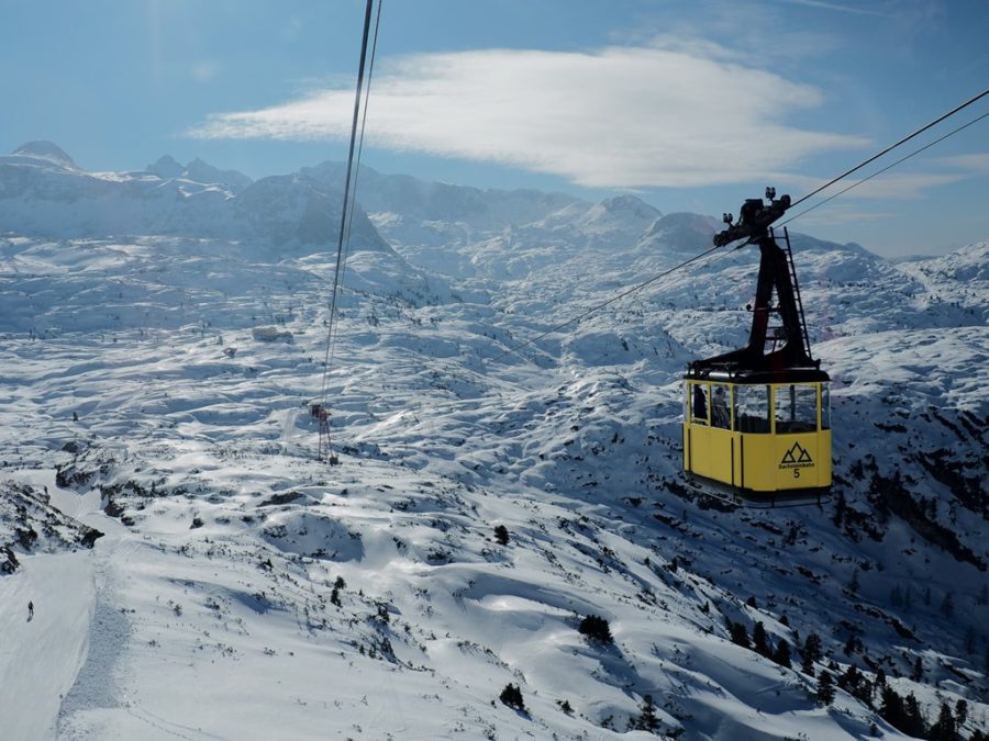 Kolejka linowa na Krippenstein wyrusza z miejscowości Obertraun. Duża, nowoczesna gondola, która zastąpiła wcześniejsze wagoniki, podobne do tych, jakie kiedyś kursowały na Kasprowy, wywozi nas na Schönbergalm (1350 m n.p.m.). Dla narciarzy to tylko stacja przesiadkowa, ale letni turyści mogą tu przyjechać by zwiedzić dwie słynne jaskinie – Mamucią i Lodową (Mammuthöhle i Rieseneishöhle). Narciarze jednak nie maja pokusy. Groty udostępniane są turystom od końca kwietnia do końca października. Teraz – nie. A zatem przesiadamy się do następnej kolejki. Ten odcinek zbudowano w 1956 roku, ale zmodernizowano tak jak poprzedni w 2007 r. Wyjeżdżamy na Krippenstein, na wysokość 2 109 m n.p.m. W sumie te dwa odcinki mają 4 km i pokonują 1500 m różnicy poziomów.