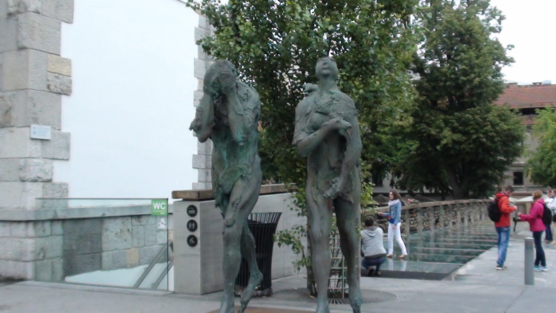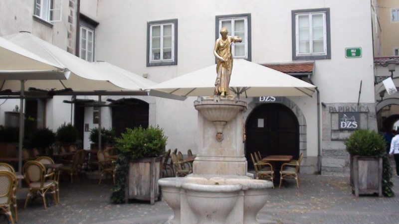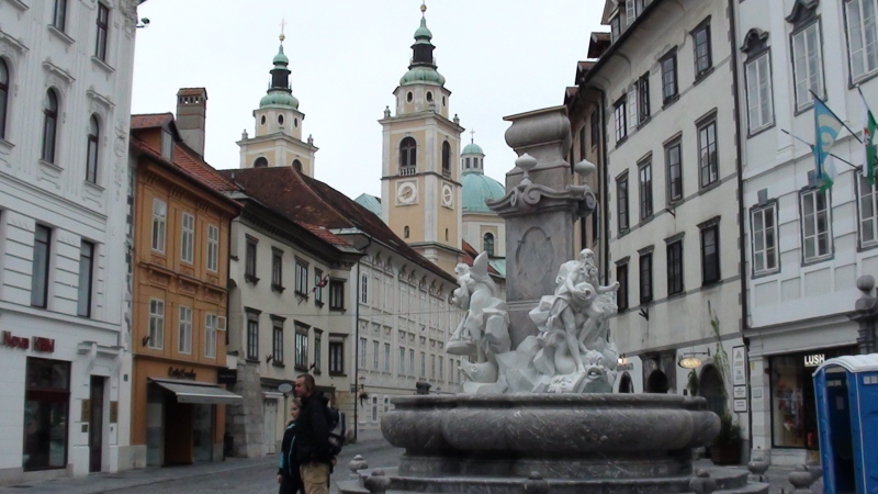 Obok ratusza stoi jedno z najpiękniejszych dzieł Francesco Robby. To studnia wodotrysk. Ozdobiona jest barokowymi personifikacjami rzek słoweńskich krain. Postaci tytanów trzymają dzbany z przelewającą się wodą Savy, Krki i Ljubljanicy. Nie wiem tylko dlaczego w takim (!) miejscu ustawiono też ?niebieską budkę? czyli toy-toya? Czyżby to dzisiejszy zabytek/nabytek?