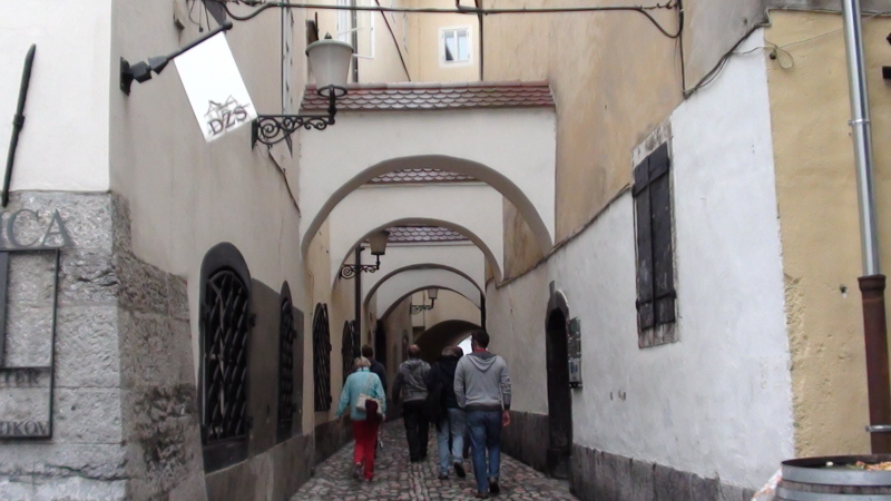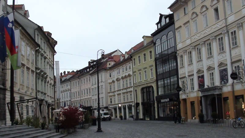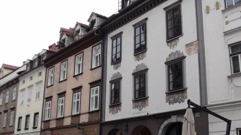 Przechodzimy przez Ribi trg, gdzie znajduje się ładna fontanna przedstawiająca kobietę w złotych szatach. Za tym placem, przy szerokiej ulicy będącej dzisiaj traktem spacerowym stoją ładne kolorowe kamienice. To Mestni trg. Wśród kamienic jest budynek Ratusza. Pochodził z XV wieku, a przebudowano go na początku XVIII wieku.