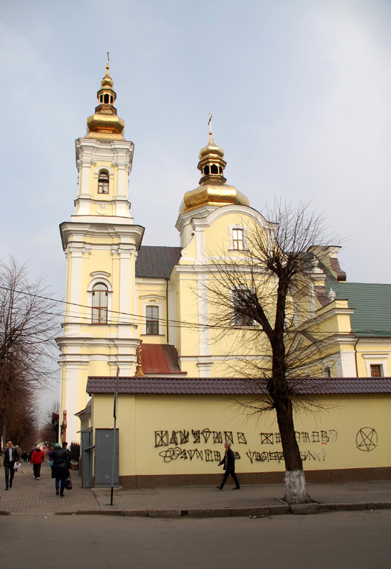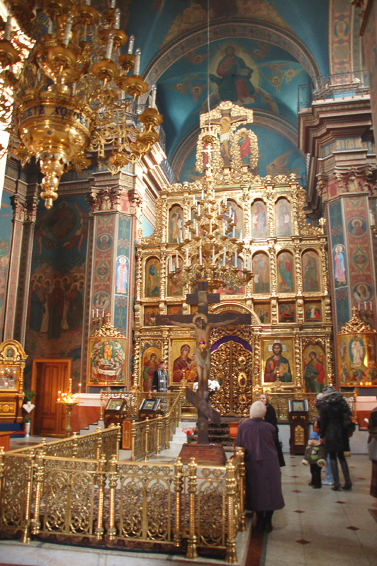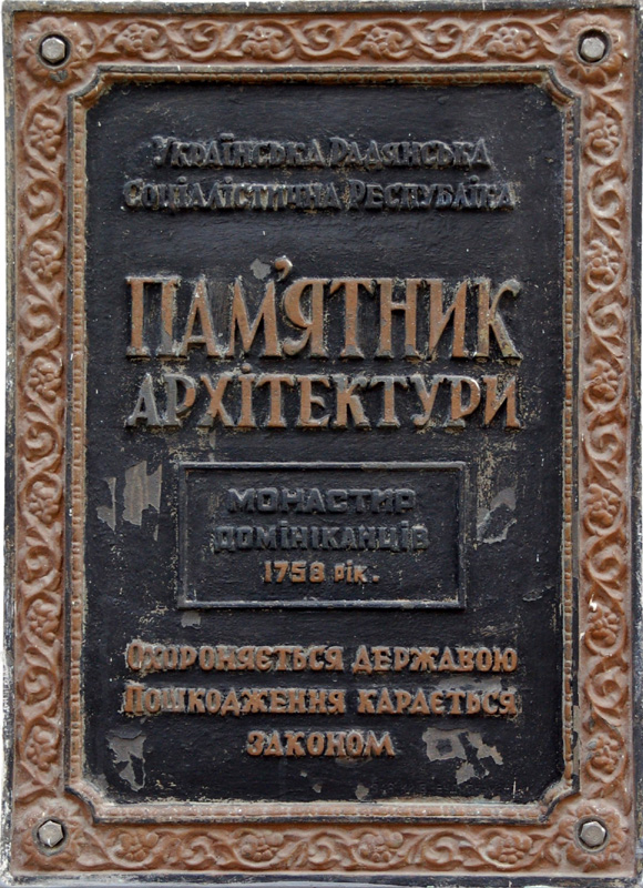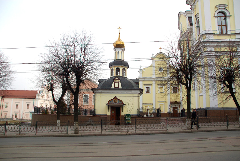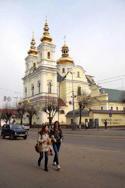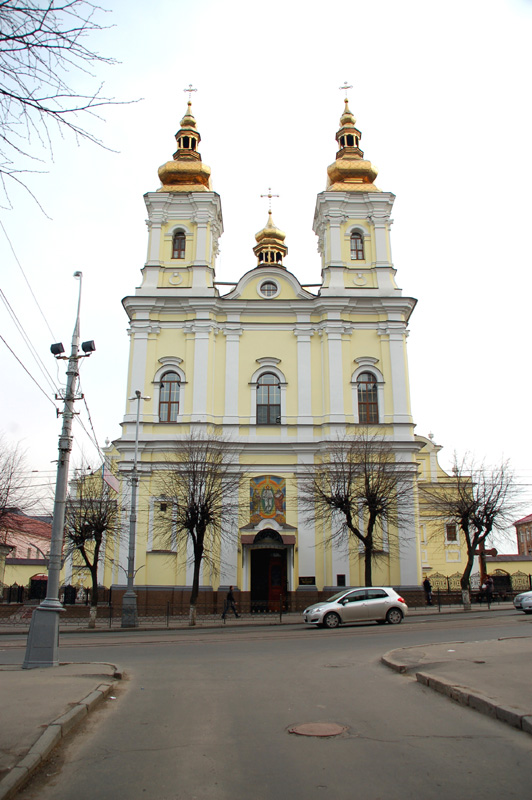 Pięknie zrekonstruowano i odnowiono dawny barokowy kościół dominikanów. Początkowo, w XVII w. drewniany, zastąpiony został w połowie XVIII w (1751-1760) przez murowany ufundowany przez Michała, sędziego ziemi bracławskiej, i jego żonę Annę Grocholskich. A wybudowany, z przyległym klasztorem, według projektu Pawła Antoniego Fontany. Po kasacji klasztoru w 1832 roku władze carskie przekazały świątynię Cerkwi prawosławnej. W czasach sowieckich, w 1945 roku zamieniono ją na salę koncertową. Usunięto wówczas wieże zakończone kopułami. Widok budowli w tej postaci można obejrzeć na zdjęciu na str. 797 w 6 tomie Nowej Encyklopedii Powszechnej PWN. W niepodległej Ukrainie świątynię przekazano w 1991 roku Kościołowi greko-katolickiemu. Ale obecnie, z odbudowanymi wieżami, jest Soborem (katedrą) Preobrażeńskim (Przemienienia Pańskiego) Ukraińskiej Cerkwi Prawosławnej Patriarchatu Moskiewskiego. Na jej frontonie znalazłem dwie tablice. Starą, żeliwną w języku ukraińskim jeszcze z czasów sowieckich informującą, że jest to pomnik architektury ? Monastyr Dominikanów z 1758 roku. I nową, też po ukraińsku: ?Ukrainśka Prawosławna Cerkwa. Swjato-Preobrażenśkyj Kafedralnyj sobor?. Na zewnątrz, po prawej stronie frontonu tej świątyni, stoi duży czteroramienny krzyż wykuty w czerwono-brunatnym granicie, z odlanym w brązie Ukrzyżowanym i ukraińskimi abrewiacjami. We wnętrzu, o ścianach i sklepieniu pokrytych malowidłami, wyróżnia się ładny złocony ikonostas, ikony na ścianach bocznych i w miejscach dawnych katolickich ołtarzy, a także żyrandole.