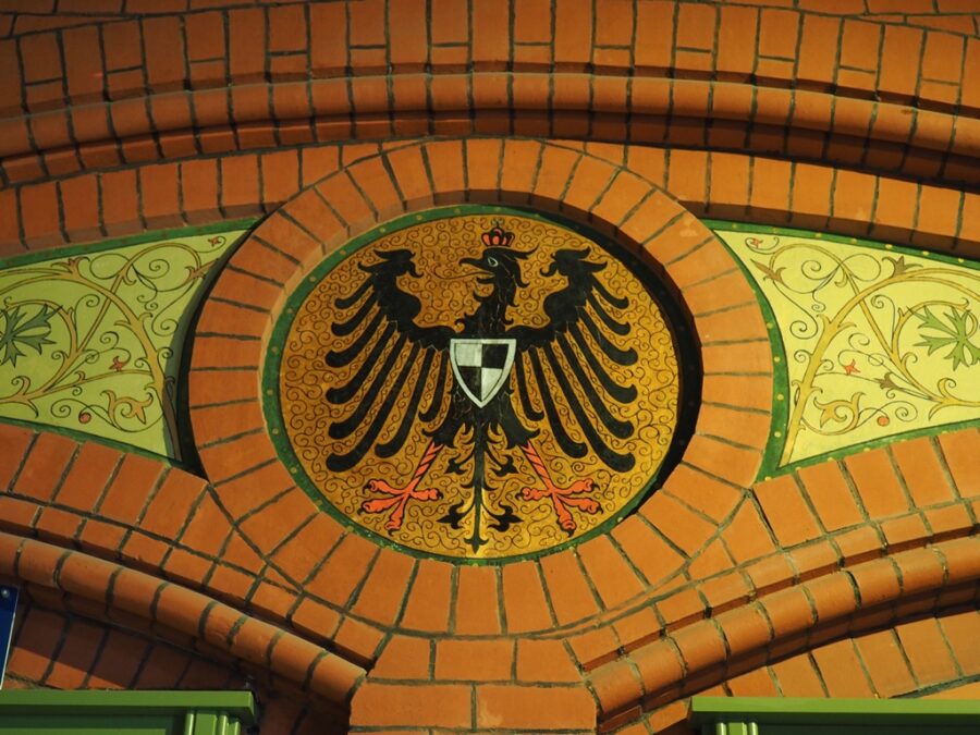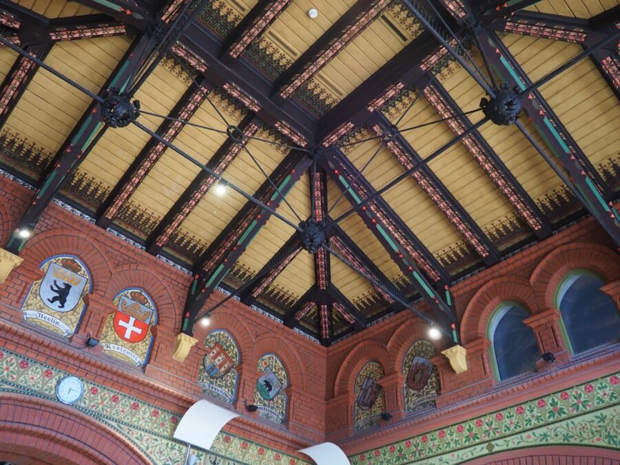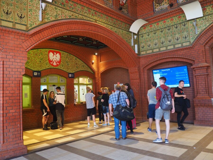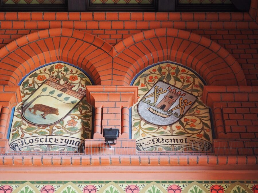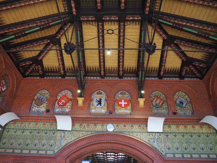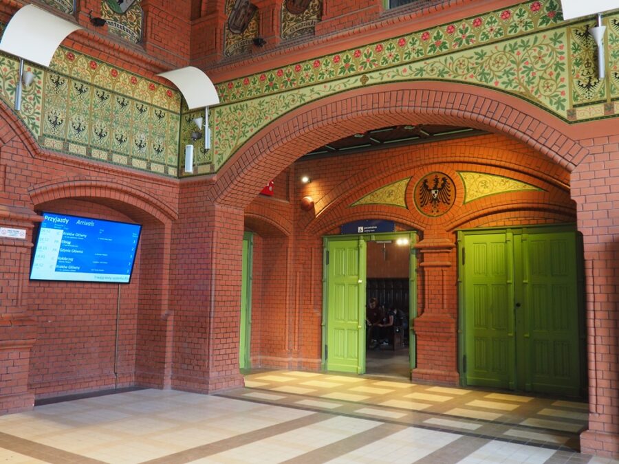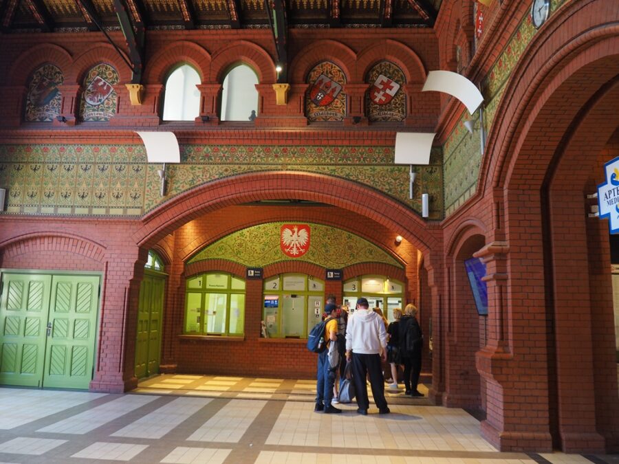 Stropy są drewniane, w poczekalni kasetonowe. Halę główną dworca zdobią herby miast pruskich. Jest i Gdańsk, i Berlin, i Królewiec, i Elbląg i inne miasta, nawet odległy Gorzów Wielkopolski. Oczywiście herby dawne, nazwy nowe – polskie. Z nieznanych mi jednak przyczyn dwa miasta zachowały nazwy niemieckie – To Memel i Insterburg. A przecież oba mają też swoje aktualne nazwy, oraz dawne, tradycyjne, polskie. Memel to po polsku Kłajpeda, po litewsku – Klaipėda. A Insterburg, obecnie w Obwodzie Kaliningradzkim, to polski Wystruć, teraz rosyjski Czerniachowsk (Черняховск). Wystarczyło zapytać Google.