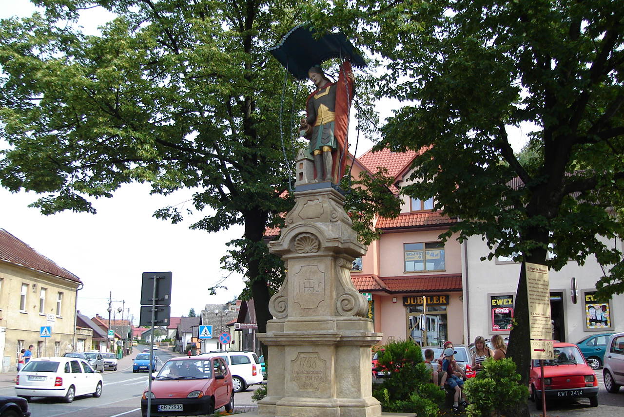 Przy końcu Rynku stoi figura św. Floriana. Pochodzi ona z 1768 roku. Została wykonana z piaskowca. Świętego, który czczony jest w Polsce jako patron strażaków i hutników, przedstawiono tu w stroju rzymskiego legionisty. Rzeźba była kilka razy restaurowana, a ostatnio w 2006 roku. Nieopodal figury jest budynek straży pożarnej z kamienną wieżą, z balkonikiem. Wieża ta jest jednym z najbardziej charakterystycznych obiektów miasta. Za figurą św. Floriana wchodzi się w uliczkę prowadzącą na Stare Miasto.