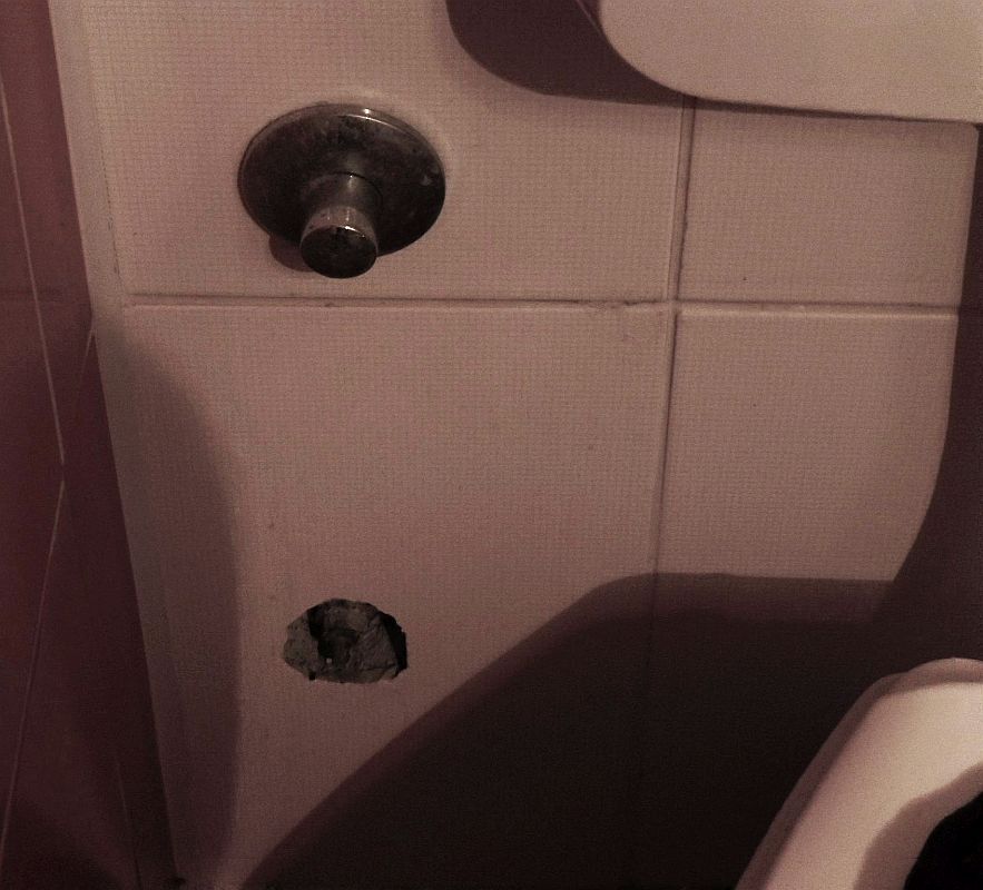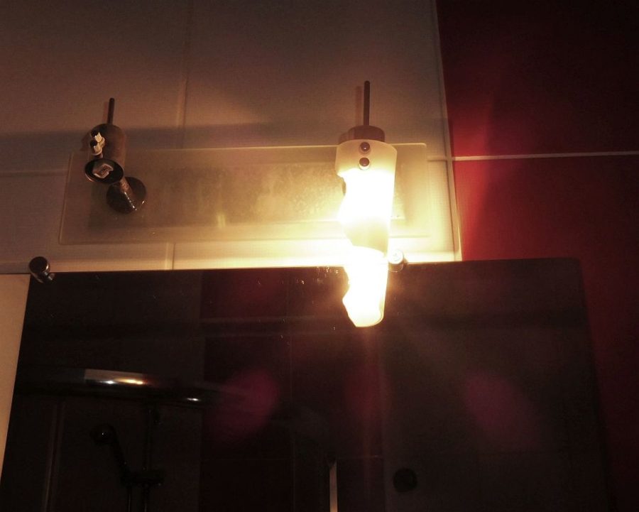 Po kolacji poszliśmy się przejść, było już ciemno. Po powrocie zapalam światło i wchodzę do łazienki. A tam przy lustrze jednej żarówki nie ma a druga świeci, ale jest mocno rozbita. Rozglądam się i oczom nie wierzę. Co za fachowy robili tu remont? Gdy stanąłem na wprost muszli wc, to po lewej stronie było wyjście dwóch rur do baterii ale na umywalkę nie było miejsca. Jeszcze bardziej się zdziwiłem gdy blisko powyżej zobaczyłem kontakt z prądem. Wymieniali lampy ale otwory po kołkach rozporowych zostawili nie zagipsowane. Byliśmy jedną noc.