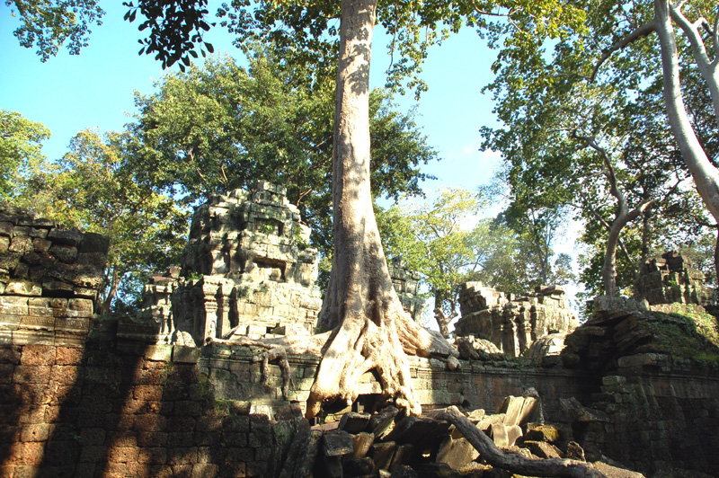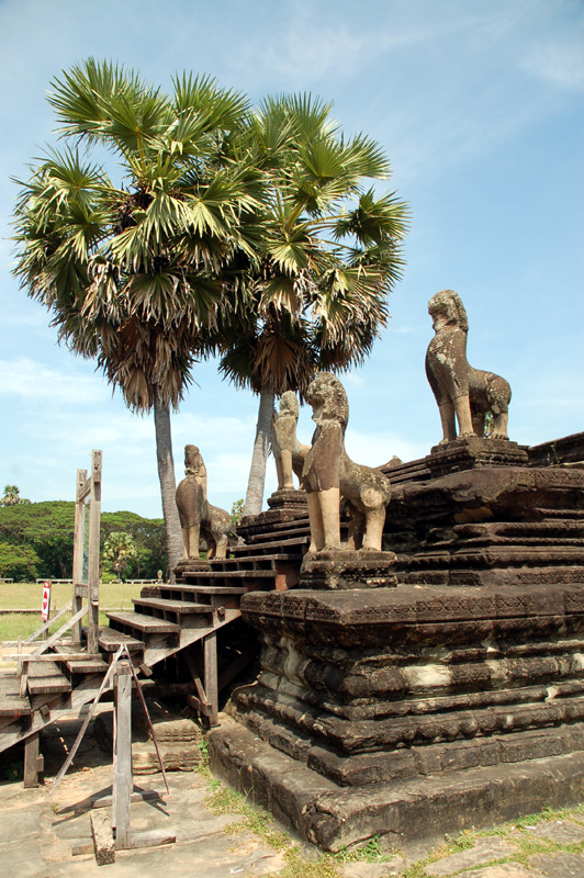 Widać z niej doskonale długi na 235 m portyk z trzema prasatami – wieżami nadbramnymi w drugim pasie murów. Przez taras na planie krzyża wchodzę przez centralną pomijając boczne pomieszczenia i dopiero wówczas widzę główny masyw świątyni z jej pięcioma wysokimi prasatami w kształcie kwiatów lotosu. Prowadzi do niego długa aleja biegnąca 1,5 metrów powyżej terenów znajdujących się po jej obu stronach. Stoją na nich dwa podłużne kamienne budynki z kolumnami kryte dachem. Poza nimi aż do dwu kwadratowych stawów, w których odbijają się wieże świątyni, jest spalona przez słonce ziemia.