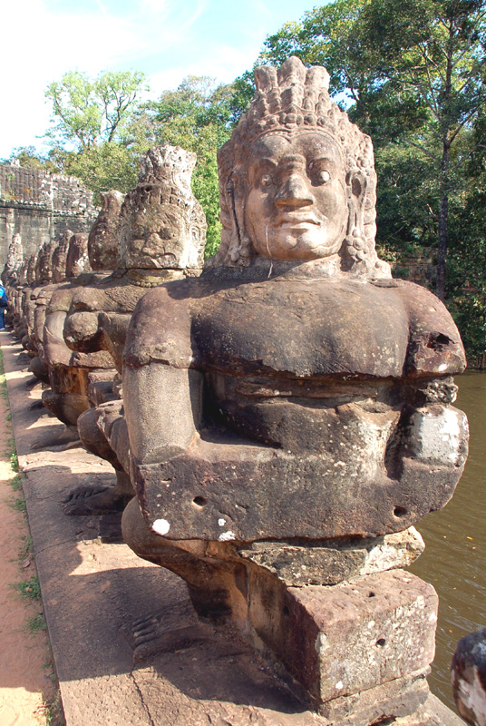 Wchodzę na dużą, długą na 250 i szeroką na 12 m ziemną groblę. Przecina ona ogromną, o nieznanej chyba nigdzie indziej wielkości, fosę wypełnioną wodą. Ma ona ponad 200 m szerokości oraz połączenie kanałem z płynąca w pobliżu rzeką Siem Reap. Zbudowano ją na planie prostokąta o bokach 1500 x1300 m, otacza cały główny zespół świątynny. Boki grobli zabezpieczają kamienne balustrady w kształcie legendarnych węży Naga zakończone 5. lub 7. głowami.