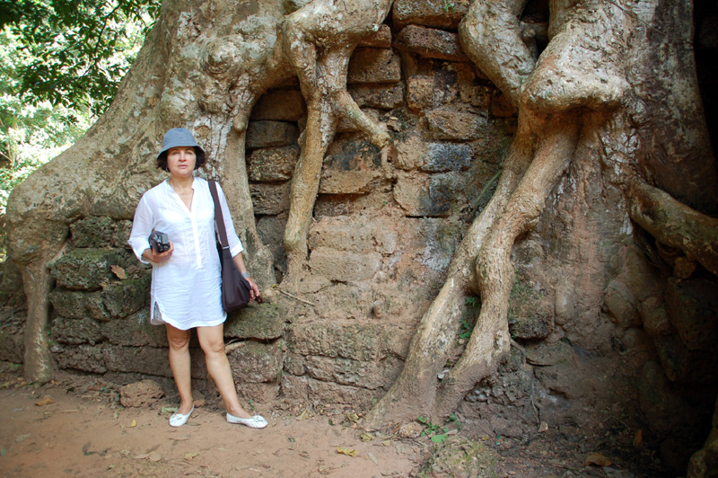 Tylko w południowej części tej ogromnej przestrzeni, na której przed wiekami stały drewniane budynki i były ulice królewskiego miasta, dostrzegam kępę drzew i  krzewów oraz… kilka sztuk pasącego się bydła. Niestety, główne wejście na teren centralnej części świątyni, po kamiennych schodach przez taras, jest zamknięte, gdyż trwa remont. Wchodzę, mijając kamienne posagi strzegących świątyni lwów, przez najbliższy po prawej stronie gopuram – wejście na krytą galerię. To na jej ścianach wykuto w kamieniu wspomniane już około 800 metrów bieżących scen mitologicznych i historycznych. Dla mnie okazały się one najciekawszą częścią Angkor Wat i jednym z najbardziej rewelacyjnych dzieł sztuki rzeźbiarskiej jakie kiedykolwiek oglądałem.