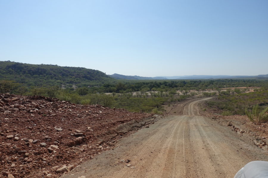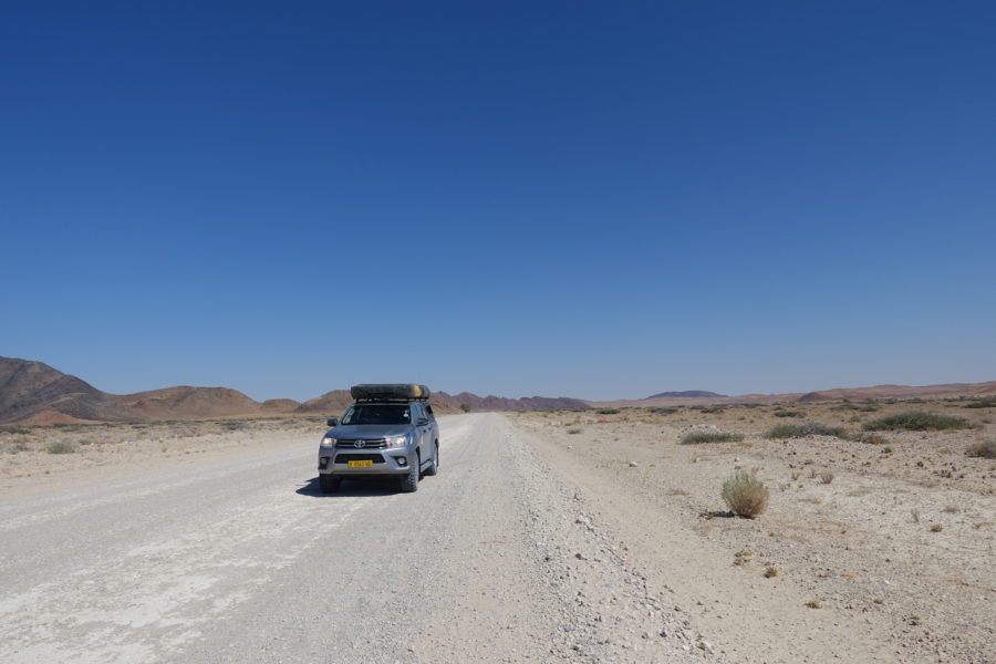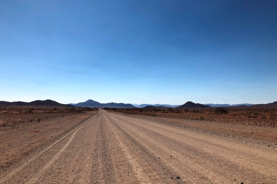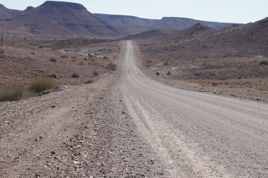 Wietrzeje już 80 milinów lat. Zmienia się co kilkanaście kilometrów. Nie nudzi się przez niemal pięć tysięcy kilometrów jazdy po namibijskich szutrach. Masyw rozsypuje się na skały, niczym wielkie krowie placki, na rumosz skalny, na skiby – niczym świeżo zaoranego pola – na wydmy, zwielokrotnionej wielkości – jak w Łebie.