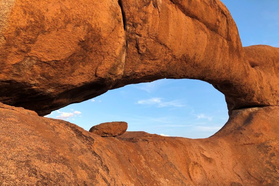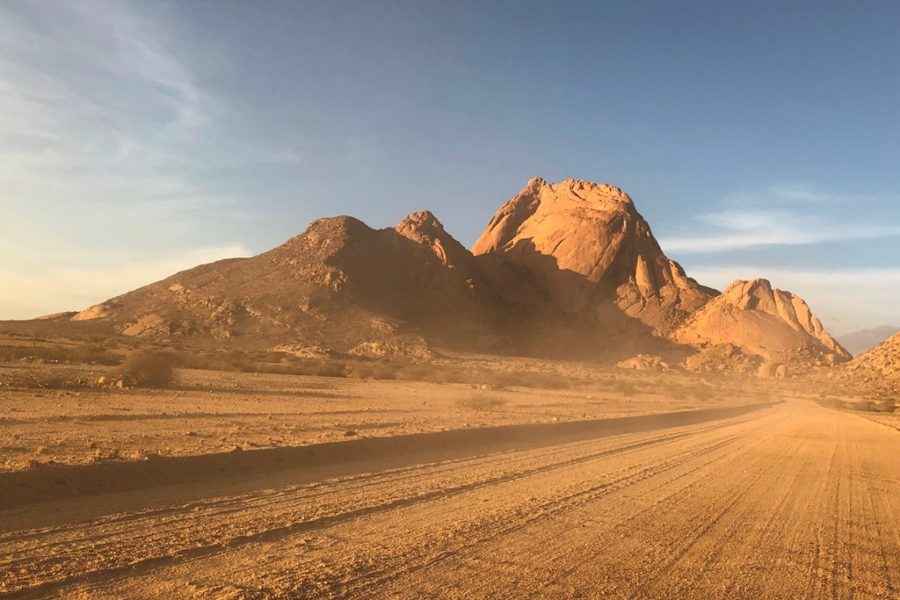 Pustynia Namib to także najwyższy szczyt Spitzkoppe. Majestatyczny kolos, widoczny jest już z dystansu 60 km. Wyrasta na pustyni na wysokość 1728 m n.p.m. Podobno granit u podstaw Soitzkoppe liczy 120 milionów lat. Z pewnością późniejsze są naskalne rysunki Buszmenów. Dzisiaj teren ten należy do Damara, którzy prowadza tam camping. Można spać we własnym namiocie pod gwiazdami z dala od cywilizacji. Bez wody bieżącej. Czekać na wschód słońca przechodzący przez skalny most.